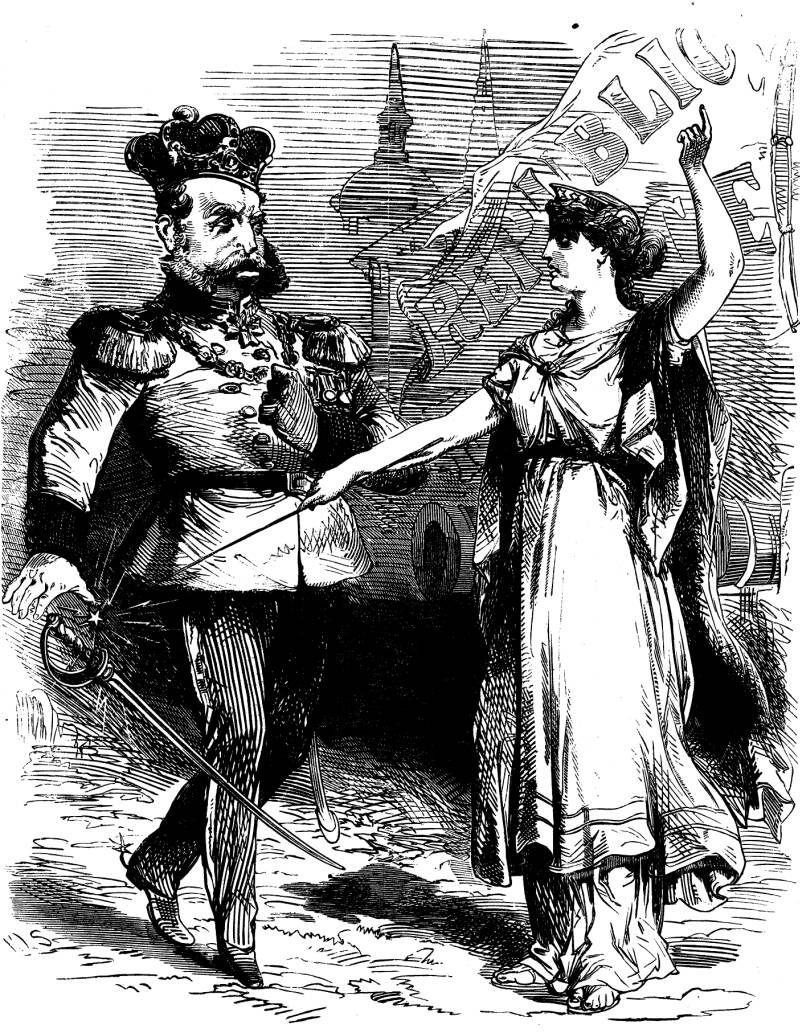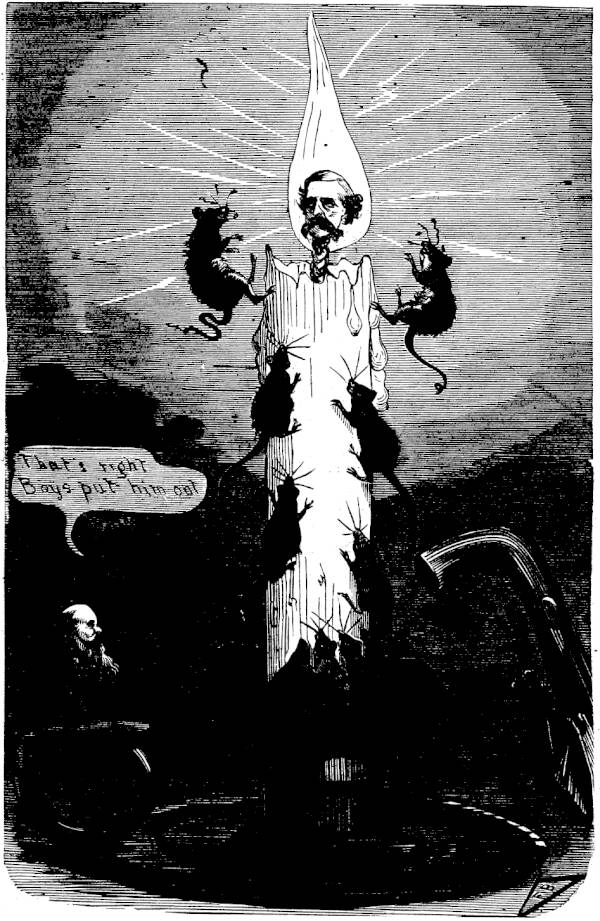 THE YOUNG DEMOC-RATS, ENCOURAGED BY THE OLD RAT DANA, COME TO GRIEF IN TRYING TO PUT OUT THE HOFFMAN LIGHT. A New Pierian Spring. The Principal of the "Student's Home," at V------, N.Y., advertising the advantages of his school, makes the following telling appeal, which we should think would be hard to resist by such as find study interfere with digestion. "COME TO V------. Its Mineral Water strengthens the body, and its Seminary the mind." The hope of eventually leaving those classic shades in such a state of two-fold invigoration, should prove inspiring to the dyspeptic and studious. Whether this constant cramming of the mind and purging of the body be the true secret of longevity as well as of scholarship, we know not; we should judge, however, from the appearance and conversation of students in general, that a system directly the reverse of the above mentioned process would be more certain of turning out the real article. Spare Us! Nor only is everybody's attention directed towards Paris, but the English Sparrows appear to be gradually Worming themselves into public estimation. They have been picking away so vigorously, since they were brought over here, that some of them are now able to pick their way across Broadway, in the muddiest weather. In course of time, we suppose the worms will disappear, and then, when these poor birds have nothing else to pick, they will go out to pic-nics. Come, arouse then, friends of the sparrow! Fetch out your bread and your grain, and fear not that these little twitterers will ever over-burden the city. A Gourd of Honor(!) The latest, and most important news from Spain is that SICKLES has been furnished with a guard by the government. Some things are managed better in Spain than in this country. SICKLES should have been placed under guard, here, many a year ago, to keep him out of mischief. "Carpe Diem." The following telegraphic item is a remarkable instance of the exactness with which news can be transmitted by the submarine cable: "LONDON, September 16. Mr. CHARLES REED, member of Parliament for Hackney, to-day unveiled the monument to ALEXANDER DEFOE, at Bunhill Fields. The monument in practically one to ROBINSON CRUSOE." With the triffing exception of calling ROBINSON DEFOE ALEXANDER DEFOE, (and that is a pardonable error, considering that ALEXANDER SELKIRK was the prototype of DANIEL CRUSOE,) the above item is perfectly satisfactory. All the more so, if one pays attention to the date, and remembers that September 16 fell upon a FRIDAY. BY TELEGRAPH FROM VARIOUS PARTS OF THE WORLD. [Special Correspondence of Punchinello.] BERLIN, October 15.—In a conversation with King WILLIAM, yesterday, he said that he relied upon the growing taste in Hoboken for Bavarian beer to destroy the sympathy of the United States with the French Republic. METZ, October 12.—While examining the fortifications to-day with BISMARCK, I lent him my cigar-holder, and he told me that Prussia would refuse to entertain any propositions tending to peace until the Schleswig-Holstein question was definitely settled. STRASBOURG, October 14—Among the priceless volumes destroyed in the library here, was a full set of ABBOTT'S NAPOLEON histories. They were all presentation copies from the author, with autograph inscriptions. The regret expressed at their destruction is deep-felt and universal. WINDSOR, Oct. 16th.—I came up to-day with VICTORIA from Balmoral. She was engaged during most of the trip in reading HORACE GREELEY'S "What I Know About Farming," with which she is much delighted. She said she thought the satire was finer than SWIFT'S, and wondered the people did not insist upon GREELEY'S being Governor. ROME, Oct. 15.—Talking this morning with the Pope, who took breakfast with me, His Holiness said he had accepted JAMES GORDON BENNETT'S invitation to come to Washington Heights on a visit, and wanted to know whether I thought he would be expected to wear his tiara during meals. I told him that I thought it would not be obligatory. DUBLIN, Oct. 16.—The Irish Republic was to-day proclaimed at Cork, with GEORGE FRANCIS TRAIN as Emperor. The Fenians say they would prefer a constitutional monarchy. PARIS, Oct. 15.—General CLUSERET assured me to-day that though Minister WASHBURNE speaks French better than a native, yet he has not entirely forgotten what little English he used to know, and further, that he is confident it is not that gentleman's intention to make himself Dictator of France by a coup d' état. LONG BRANCH, Oct. 22—While smoking to-day with GRANT, I asked him what he thought of the European complication, and he answered with a most expressive silence.