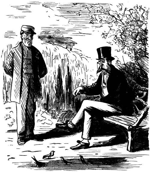 THE RETORT COURTEOUS. Newly-arrived Briton. "ENGLISH SPARROWS?—IMPOSSIBLE. WHY, THEY CHIRP THROUGH THEIR LITTLE NOSES LIKE WEGULAR YANKEES." Park-Keeper. "WELL, I DON'T KNOW, BUT IT TAKES TWO MEN AND A CART, EVERY DAY TO REMOVE THE 'Hs' DROPPED BY THEM ABOUT THE PARK." OUR PORTFOLIO. PARIS, FIRST WEEK OF THE REPUBLIC, 1870. DEAR PUNCHINELLO: Things are becoming so mixed here that I am thinking of retiring to Tours with the other tourists. The city is all on the go—that is to say, the non-combatants are all going out of it as fast as possible. GAMBETTA left here the early part of the week, and it was better for him that he should. I wouldn't give a sou for any of these republicans if they chance to fall into the clutches of King WILLIAM. It is reported that he has issued an order for the strangulation of all French children between the ages of three and five, in reprisal for the treacherous blowing up of Germans at Laon. BISMARCK has requested the privilege of cooking ROCHEFORT'S mutton for him, should he be taken alive when Paris falls. What he means by "cooking his mutton" has not yet transpired, but it is gloomily vaticinated that he intends to boil him down. ROCHEFORT mutton with caper sauce ought to satisfy the epicurean taste of BISMARCK, especially as ROCHEFORT would cease his caperings from that hour. Late last night there was an alarm in the city that the whole Prussian army was at Noisy-le-Sec. As you may have suspected, a noisy demonstration followed this announcement. I got out of bed, rang the bell, and requested the concierge to bring me an auger. The man looked a little astonished at what he undoubtedly considered a strange request. For a man to get out of bed in the middle of the night and call for an auger, was indeed a trifle peculiar. When he brought it, I increased his astonishment by proceeding to bore a hole through the top of my trunk. "C'est un imbécile," said the concierge, retreating a step or two. "Not much," I retorted, boring away with renewed vigor. Presently the orifice was made. Into it I thrust an Alpen stock which had accompanied me in many a toilsome march through Switzerland, and lifting the lid, took from the cradle of the trunk a star-spangled banner made of silk, which had been presented to me by the Young Men's Christian Association of New York, prior to my departure for Europe, as a token of their esteem for my services in the capacity of a "reformed drunkard." I fastened the flag to the stock, put my boots, clothes and other valuables on top of the trunk, and in a voice intended to express my defiance of King WILLIAM and his German Lagerheads, spoke these words: Wave fearless, there, thou standard sheet!
