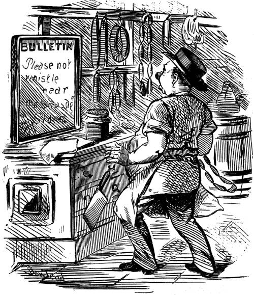 Butcher, "HA! I SHOULD LIKE TO CATCH THE DOG THAT PLAYED ME THAT 'ERE TRICK!—I'D BULLETIN HIM!" |