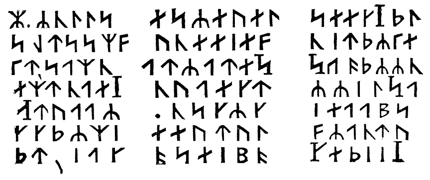„Het is runisch schrift; deze letterteekens zijn geheel overeenkomstig met die van het handschrift van Snorre Turleson! Maar … wat zou het toch beteekenen?”