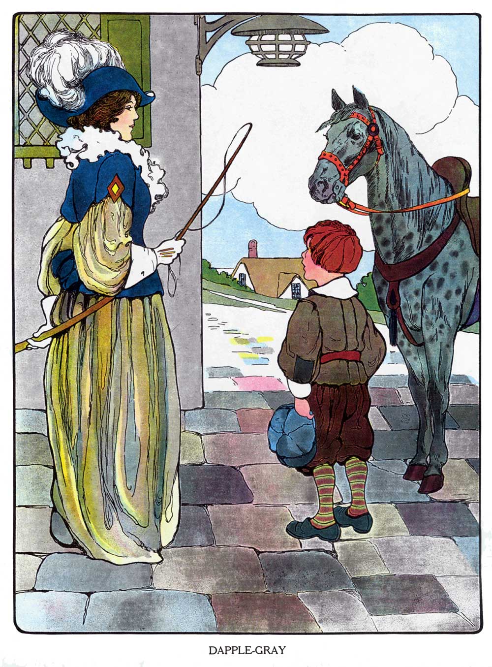 Here goes my lord A trot, a trot, a trot, a trot, Here goes my lady A canter, a canter, a canter, a canter! Here goes my young master Jockey-hitch, jockey-hitch, jockey-hitch, jockey-hitch! Here goes my young miss An amble, an amble, an amble, an amble! The footman lags behind to tipple ale and wine, And goes gallop, a gallop, a gallop, to make up his time. |