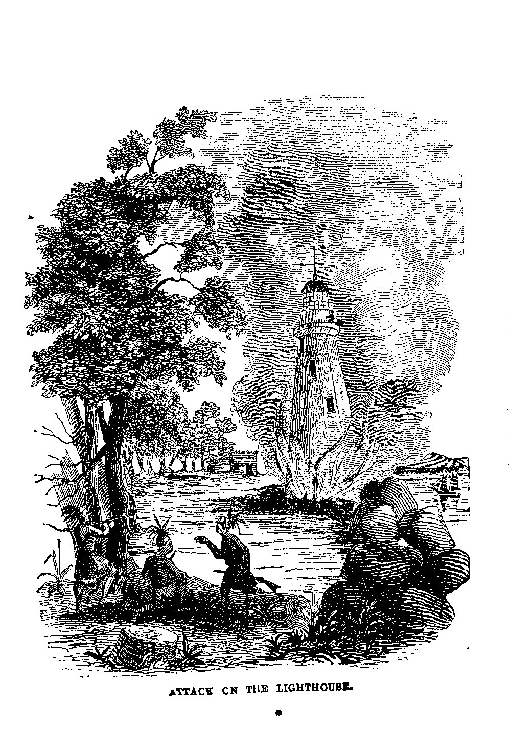 An incident occurred at the Key Biscayne lighthouse, during the Florida war, which is perhaps worth recording. The lighthouse, was kept by a man named Thompson. His only companion was an old negro man; they both lived in a small hut near the lighthouse. One evening about dark they discovered a party of some fifteen or twenty Indians creeping upon them, upon which they immediately retreated into the lighthouse, carrying with them a keg of gunpowder, with the guns and ammunition. From the windows of the lighthouse Thompson fired upon them several times, but the moment he would show himself at the window, the glasses would be instantly riddled by the rifle balls, and he had no alternative but to lie close. The Indians meanwhile getting out of patience, at not being able to force the door, which Thompson had secured, collected piles of wood, which, being placed against the door and set fire to, in process of time not only burnt through the door, but also set fire to the stair-case conducting to the lantern, into which Thompson and the negro were compelled to retreat. From this, too, they were finally driven by the encroaching flames, and were forced outside on the parapet wall, which was not more than three feet wide.