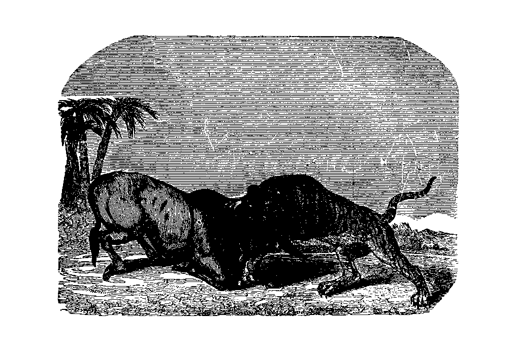"I was at Jaffna, at the northern extremity of the Island of Ceylon, in the beginning of the year 1819: when, one morning, my servant called me an hour or two before my usual time, with, 'Master, master! people sent for master's dogs--tiger in the town!' Now, my dogs chanced to be some very degenerate specimens of a fine species, called the Poligar dog, which I should designate as a sort of wiry-haired grayhound, without scent. I kept them to hunt jackals; but tigers are very different things: by the way, there are no real tigers in Ceylon; but leopards and panthers are always called so, and by ourselves as well as by the natives. This turned out to be a panther. My gun chanced not to be put together; and while my servant was doing it, the collector, and two medical men, who had recently arrived, came to my door, the former armed with a fowling-piece, and the latter with remarkably blunt hog-spears. They insisted upon setting off without waiting for my gun, a proceeding not much to my taste. The tiger (I must continue to call him so) had taken refuge in a hut, the roof of which, as those of Ceylon huts in general, spread to the ground like an umbrella; the only aperture into it was a small door, about four feet high. The collector wanted to get the tiger out at once. I begged to wait for my gun; but no--the fowling-piece (loaded with ball, of course) and the two hog-spears were quite enough. I got a hedge-stake, and awaited my fate, from very shame. At this moment, to my great delight, there arrived from the fort an English officer, two artillery-men, and a Malay captain; and a pretty figure we should have cut without them, as the event will show. I was now quite ready to attack, and my gun came a minute afterward. The whole scene which follows took place within an enclosure, about twenty feet square, formed, on three sides, by a strong fence of palmyra leaves, and on the fourth by the hut. At the door of this the two artillery-men planted themselves; and the Malay captain got on the top, to frighten the tiger out, by worrying it--an easy operation, as the huts there are covered with cocoa-nut leaves. One of the artillery-men wanted to go in to the tiger, but we would not suffer it. At last the beast sprang; this man received him on his bayonet, which he thrust apparently down his throat, firing his piece at the same moment. The bayonet broke off short, leaving less than three inches on the musket; the rest remained in the animal, but was invisible to us: the shot probably went through his cheek, for it certainly did not seriously injure him, as he instantly rose upon his legs, with a loud roar, and placed his paws upon the soldier's breast. At this moment, the animal appeared to me to about reach the center of the man's face; but I had scarcely time to observe this, when the tiger, stooping his head, seized the soldier's arm in his mouth, turned him half round staggering, threw him over on his back, and fell upon him. Our dread now was, that if we fired upon the tiger, we might kill the man: for a moment there was a pause, when his comrade attacked the beast exactly in the same manner as the gallant fellow himself had done. He struck his bayonet into his head; the tiger rose at him--he fired; and this time the ball took effect, and in the head. The animal staggered backward, and we all poured in our fire. He still kicked and writhed; when the gentlemen with the hog-spears advanced, and fixed him, while the natives finished him, by beating him on the head with hedge-stakes. The brave artillery-man was, after all, but slightly hurt: he claimed the skin, which was very cheerfully given to him. There was, however, a cry among the natives that the head should be cut off: it was; and in so doing, the knife came directly across the bayonet. The animal measured scarcely less than four feet from the root of the tail to the muzzle There was no tradition of a tiger having been in Jaffna before; indeed, this one must have either come a distance of almost twenty miles, or have swam across an arm of the sea nearly two in breadth; for Jaffna stands on a peninsula, on which there is no jungle of any magnitude."