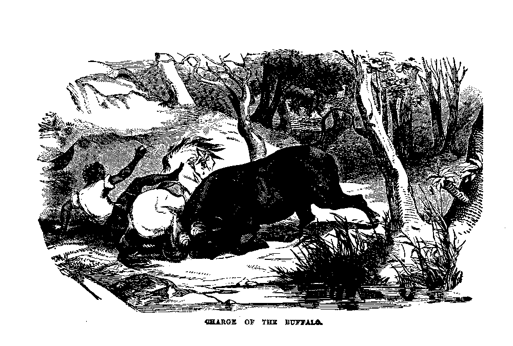"The maddened brute approached, growling and gnashing his teeth, and, with a savage spring, encircled the body of the hunter and the tree in his iron gripe. The next moment, the flashing blade of the couteau chasse tore his abdomen, and his smoking entrails rolled upon the ground. At this exciting crisis of the struggle, the other man, accompanied by the dog, came up in time to witness the triumphal close of the conflict.