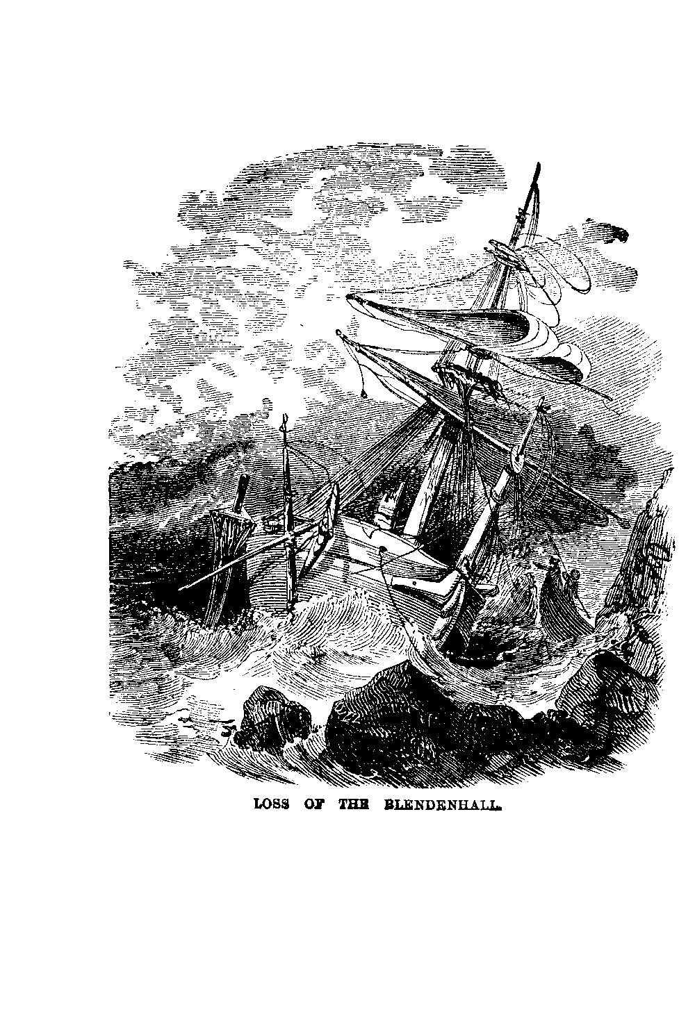 We had scarcely got out of the lock and cleared the heads, however, when we plunged at once into all the miseries of a gale of wind blowing from the west. During the three following days, it continued to increase in violence, when the islands of Coll and Tiree became visible to us. As the wind had now chopped round more to the north, and continued unabated in violence, the danger of getting involved among the numerous small islands and rugged headlands, on the northwest coast of Inverness-shire, became evident. It was therefore deemed expedient to wear the ship round, and make a port with all expedition. With this view, and favored by the wind, a course was shaped for Lochswilly, and away we scudded under close-reefed foresail and main-topsail, followed by a tremendous sea, which threatened every moment to overwhelm us, and accompanied by piercing showers of hail, and a gale which blew with incredible fury. The same course was steered until next day about noon, when land was seen on the lee-bow. The weather being thick, some time elapsed before it could be distinctly made out, and it was then ascertained to be the island of North Arran, on the coast of Donegal, westward of Lochswilly. The ship was therefore hauled up some points, and we yet entertained hopes of reaching an anchorage before nightfall, when the weather gradually thickened, and the sea, now that we were upon the wind, broke over us in all directions. Its violence was such, that in a few minutes several of our ports were stove in, at which the water poured in in great abundance, until it was actually breast high on the lee-side of the main deck. Fortunately, but little got below, and the ship was relieved by taking in the foresail. But a dreadful addition was now made to the precariousness of our situation, by the cry of "land a-head!" which was seen from the forecastle, and must have been very near. Not a moment was now lost in wearing the ship round on the other tack, and making what little sail could be carried, to weather the land we had already passed. This soon proved, however, to be a forlorn prospect, for it was found that we should run our distance by ten o'clock. All the horrors of shipwreck now stared us in the face, aggravated tenfold by the darkness of the night, and the tremendous force of the wind, which now blew a hurricane. Mountains are insignificant when speaking of the sea that kept pace with it; its violence was awful beyond description, and it frequently broke over all the poor little ship, that shivered and groaned, but behaved admirably.