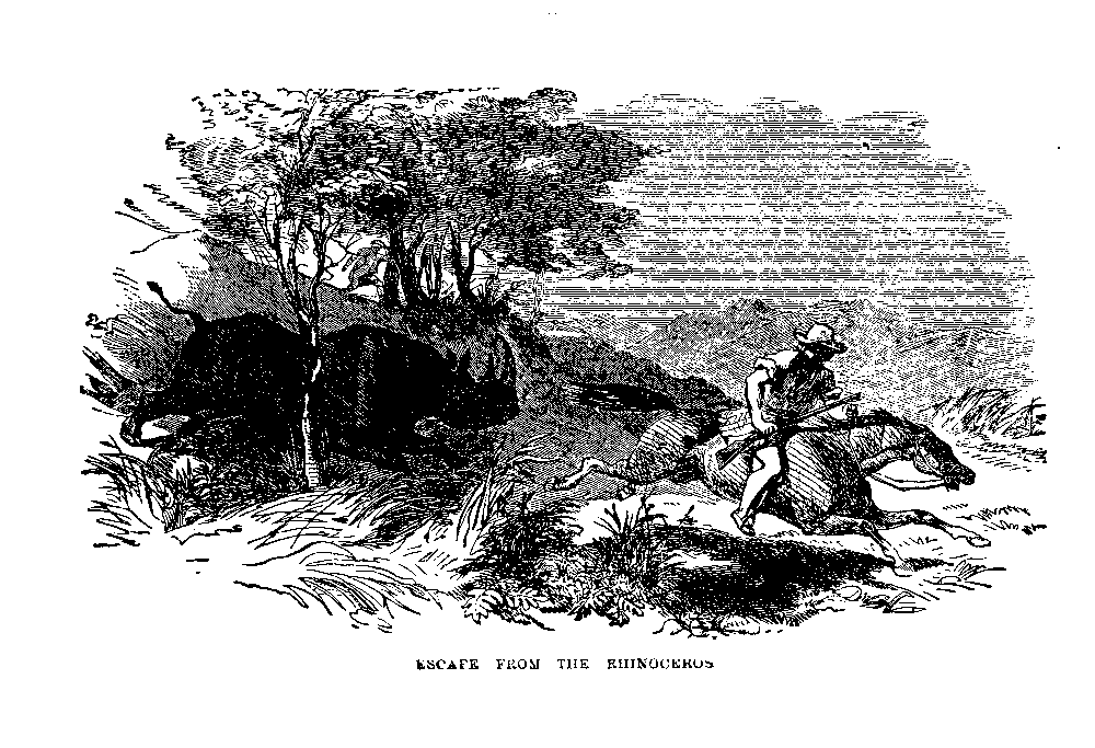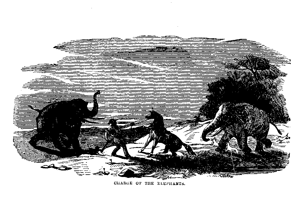 On the 27th, as day dawned, says Mr. Cumming, I left my shooting-hole, and proceeded to inspect the spoor of my wounded rhinoceros. After following it for some distance I came to an abrupt hillock, and fancying that from the summit a good view might be obtained of the surrounding country, I left my followers to seek the spoor, while I ascended. I did not raise my eyes from the ground until I had reached the highest pinnacle of rock. I then looked east, and to my inexpressible gratification, beheld a troup of nine or ten elephants quietly browsing within a quarter of a mile of me. I allowed myself only one glance at them, and then rushed down to warn my followers to be silent. A council of war was hastily held, the result of which was my ordering Isaac to ride hard to camp, with instructions to return as quickly as possible, accompanied by Kleinboy, and to bring me my dogs, the large Dutch rifle, and a fresh horse. I once more ascended the hillock to feast my eyes upon the enchanting sight before me, and, drawing out my spy-glass, narrowly watched the motions of the elephants. The herd consisted entirely of females, several of which were followed by small calves.