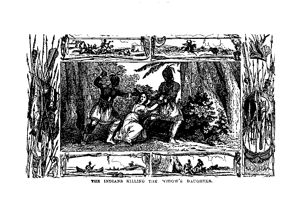 One clear, cold morning, about two years after their marriage, Susan was awakened by a loud crash, immediately succeeded by Nero's deep baying. She recollected that she had shut him in the house, as usual, the night before. Supposing he had winded some solitary wolf or bear prowling around the hut, and effected his escape, she took little notice of the circumstance; but a few moments after came a shrill, wild cry, which made her blood run cold. To spring from her bed, throw on her clothes, and rush from the hut, was the work of a minute. She no longer doubted what the hound was in pursuit of. Fearful thoughts shot through her brain; she called wildly on Nero, and, to her joy, he came dashing through the thick underwood. As the dog drew near, she saw that he galloped heavily, and carried in his mouth some large, dark creature. Her brain reeled; she felt a cold and sickly shudder dart through her limbs. But Susan was a hunter's daughter, and, all her life, had been accustomed to witness scenes of danger and of horror, and in this school had learned to subdue the natural timidity of her character. With a powerful effort, she recovered herself, just as Nero dropped at her feet a little Indian child, apparently between three and four years old. She bent down over him; but there was no sound or motion: she placed her hand on his little, naked chest; the heart within had ceased to beat: he was dead! The deep marks of the dog's fangs were visible on the neck; but the body was untorn. Old Nero stood, with his large, bright eyes fixed on the face of his mistress, fawning on her, as if he expected to be praised for what he had done, and seemed to wonder why she looked so terrified. But Susan spurned him from her; and the fierce animal, who would have pulled down an Indian as he would a deer, crouched humbly at the young woman's feet. Susan carried the little body gently in her arms to the hut, and laid it on her own bed. Her first impulse was to seize the loaded rifle that hung over the fire-place, and shoot the hound; and yet she felt she could not do it, for, in the lone life she led, the faithful animal seemed like a dear and valued friend, who loved and watched over her, as if aware of the precious charge intrusted to him. She thought, also, of what her husband would say, when, on his return, he should find his old companion dead. Susan had never seen Tom roused. To her he had ever shown nothing but kindness; yet she feared as well as loved him, for there was a fire in those dark eyes which told of deep, wild passions hidden in his breast, and she knew that the lives of a whole tribe of Indians would be light in the balance against that of his favorite hound.