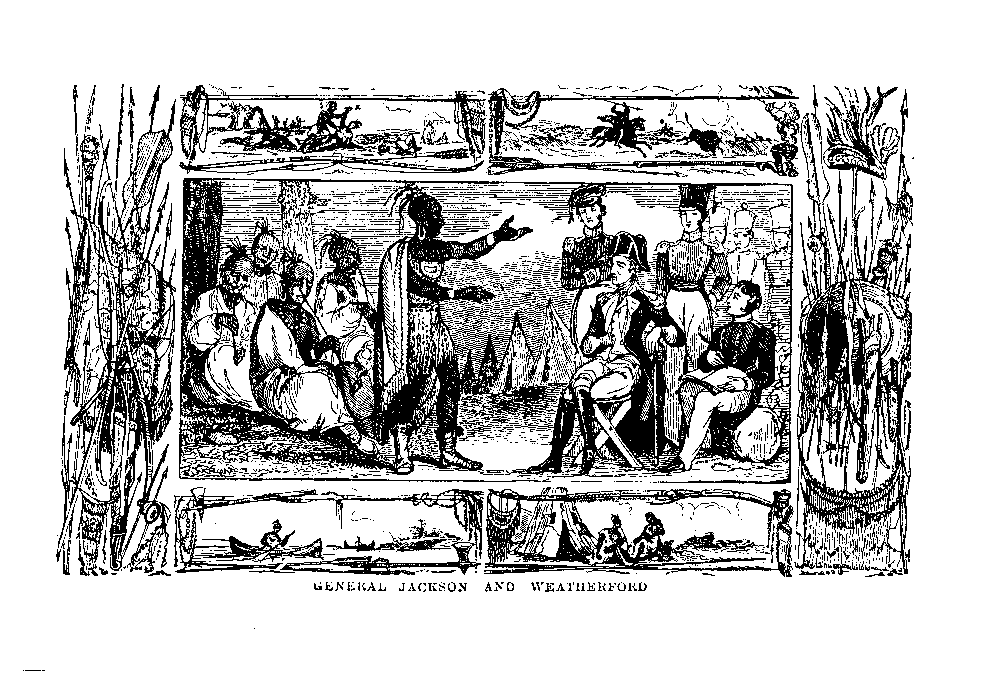 After the battle of Tallapoosa, General Jackson returned with his victorious army to Fort Williams; but, determined to give his enemy no opportunity of retrieving the misfortune that had befallen him, he recommenced operations immediately afterward. On the 7th of April, 1814, he again set out for Tallapoosa, with the view of forming a junction with the Georgia troops under Colonel Milton, and completing the subjugation of the country. On the 14th of that month, the union of the two armies was effected, and both bodies moved to a place called the Hickory Ground, where, it was expected, the last final stand would be made by the Indians, or terms of submission would be agreed on. The principal chiefs of the different tribes had assembled here, and, on the approach of the army, sent a deputation to treat for peace. Among them was Weatherford, celebrated equally for his talents and cruelty, who had directed the massacre at Fort Mimms. It had been the intention of General Jackson, to inflict a signal punishment upon him, if ever in his power. Struck, however, with the bold and nervous eloquence of this fearless savage, and persuaded of the sincerity of his wishes for peace, he dismissed him without injury. Some of the speeches of this warrior have been preserved, and exhibit a beautiful specimen of the melancholy but manly tone of a savage hero, lamenting the misfortunes of his race. Addressing General Jackson, he said, "I am in your power--do with me as you please. I am a soldier. I have done the white people all the harm I could; I have fought them, and fought them bravely. There was a time when I had a choice, and could have answered you: I have none now,--even hope is ended. Once I could animate my warriors; but I can not animate the dead. My warriors can no longer hear my voice; their bones are at Talladega, Tallushatchee, Emuckfaw, and Tohopeka. While there was a chance of success, I never left my post, nor supplicated peace. But my people are gone; and I now ask it for my nation and myself." He shortly afterward became the instrument of restoring peace, which was concluded by the total submission of the Indians. They agreed to retire in the rear of the army, and occupy the country to the east of the Coosa; while a line of American posts was established from Tennessee and Georgia, to the Alabama, and the power and resources of these tribes were thus effectually destroyed.