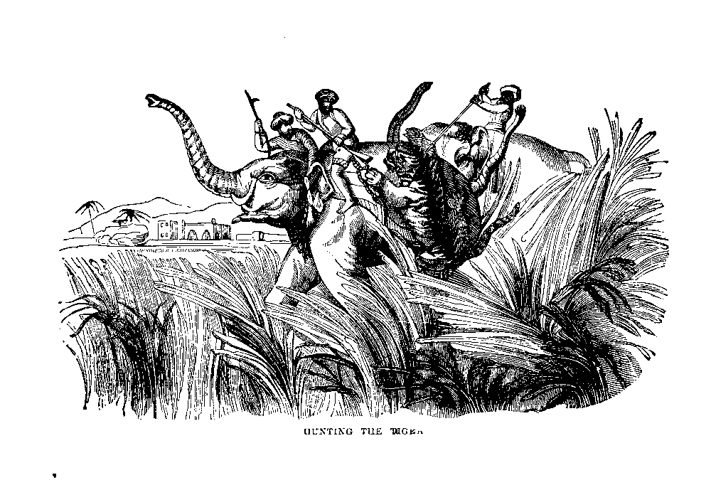 "When a tiger springs on an elephant, the latter is generally able to shake him off under his feet, and then woe be to him. The elephant either kneels on him and crushes him at once, or gives him a kick which breaks half his ribs, and sends him flying perhaps twenty paces. The elephants, however, are often dreadfully torn; and a large old tiger clings too fast to be thus dealt with. In this case it often happens that the elephant himself falls, from pain, or from the hope of rolling on his enemy; and the people on his back are in very considerable danger both from friends and foes. The scratch of a tiger is sometimes venomous, as that of a cat is said to be. But this does not often happen; and, in general, persons wounded by his teeth or claws, if not killed outright, recover easily enough.