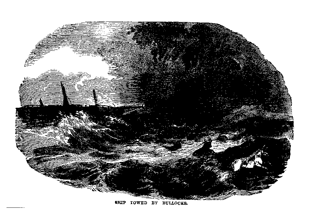 A few years since the ship Ariadne, freighted principally with live cattle, started on a voyage from Quebec, bound to Halifax. A gale came on, which continued to increase in fury, until it became a perfect hurricane. The ship was dismasted, and when the mainmast fell, three poor fellows were crushed to death. A little before sunset, on the second day of the gale, the appalling cry of "Breakers ahead!" was raised. All eyes were instinctively turned in one direction; and, about a mile off, the sea was as a boiling caldron. Toward the breakers the hull was now drifting, unmanageable, every moment threatened with destruction. For about half an hour, there was intense anxiety, and an agony of suspense on board. At length she entered the breakers. A large wave raised her, and she struck heavily on the rocks as the waves receded; it was evident, from constant striking upon the bottom, that the vessel must soon go to pieces; and the sea made a clean break over her, about half of the length from the stern. The officers and crew were huddled together upon the deck forward, intent upon devising means of escape; at last the captain thought of a plan, which, though novel, proved successful. He fastened ropes to the horns of several bullocks, and drove them into the sea, their strong, instinctive love of life impelled them forward, and several of them reached the shore. The ropes were fastened by some men, who had assembled for the relief of those on the vessel, and after much exertion and danger all on board were rescued from their perilous situation, and landed in safety.