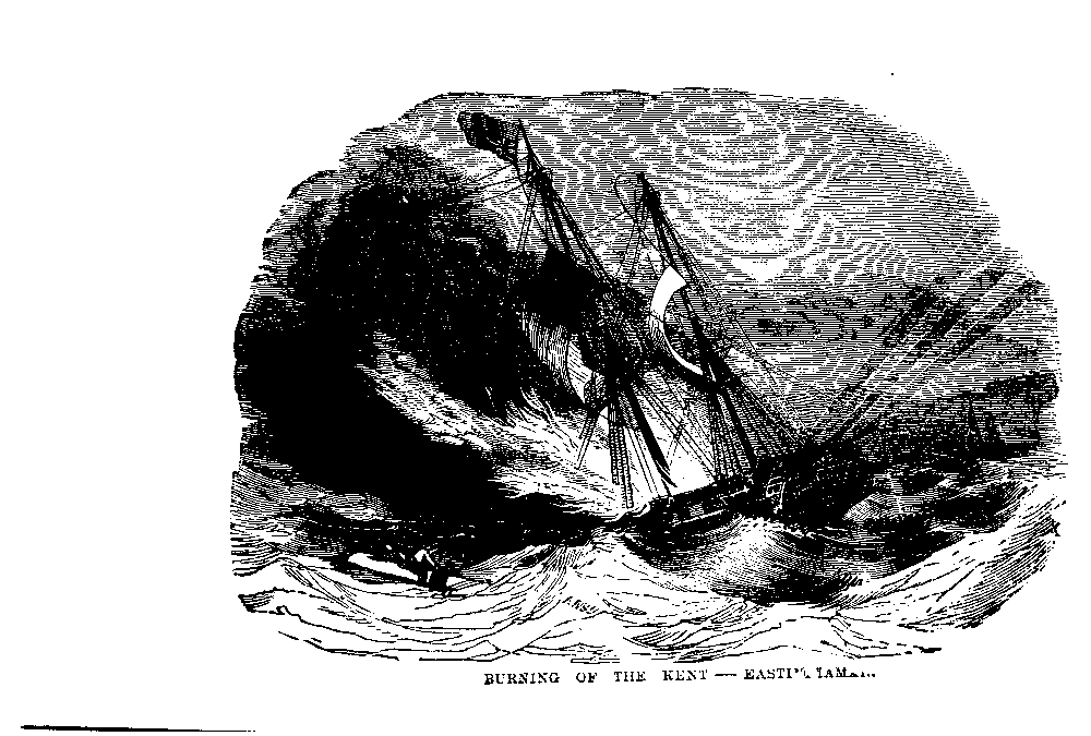 The annexed engraving represents the burning of the Kent, East Indiaman, in the Bay of Biscay. She had on board in all six hundred and forty-one persons at the time of the accident. The fire broke out in the hold during a storm. An officer on duty, finding that a spirit cask had broken loose, was taking measures to secure it, when a lurch of the ship caused him to drop his lantern, and, in his eagerness to save it, he let go the cask, which suddenly stove in, the spirits communicated with the flame, and the whole place was instantly in a blaze. Hopes of subduing the fire at first were strong, but soon heavy volumes of smoke and a pitchy smell told that it had reached the cable-room.