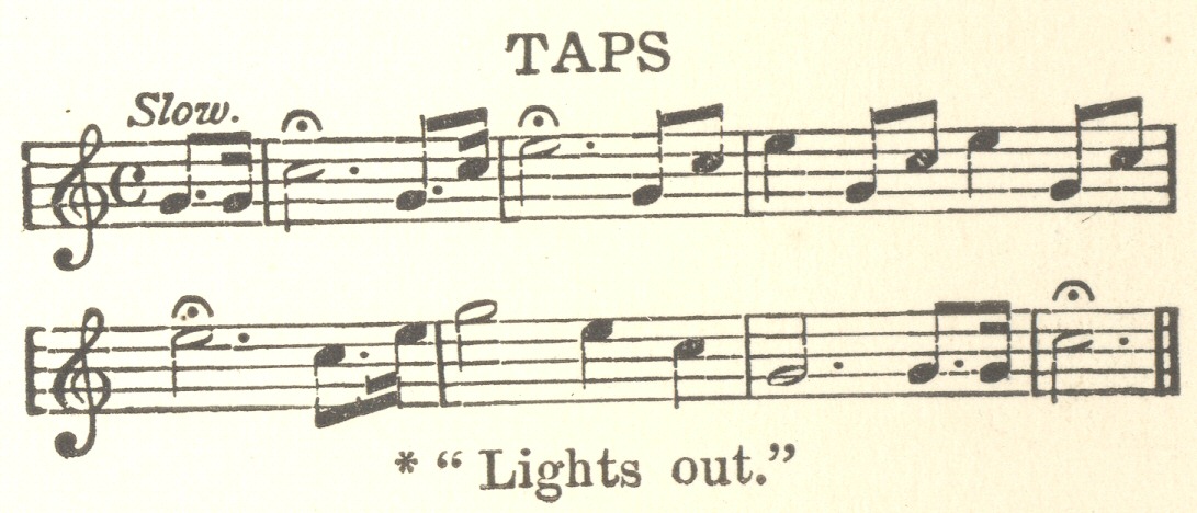 Now an impressive pause—then the bugle sang “Taps”—translatable, this time, into “Good-bye, and God keep us all!” for taps is the soldier’s nightly release from duty, and farewell: plaintive, sweet, pathetic, for the morning is never sure, for him; always it is possible that he is hearing it for the last time. . . .