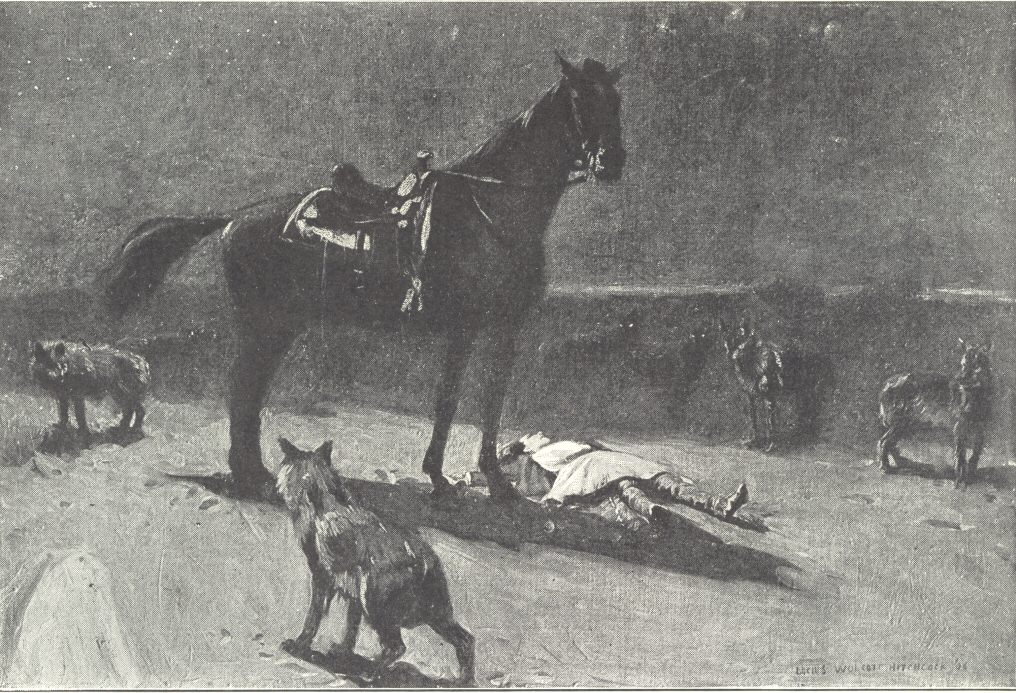 At the point which I had reached in a preceding paragraph of this account, the situation was as follows: two horses lay dying; the bull had scattered his persecutors for the moment, and stood raging, panting, pawing the dust in clouds over his back, when the man that had been wounded returned to the ring on a remount, a poor blindfolded wreck that yet had something ironically military about his bearing—and the next moment the bull had ripped him open and his bowls were dragging upon the ground: and the bull was charging his swarm of pests again. Then came pealing through the air a bugle-call that froze my blood—“It is I, Soldier—come!” I turned; Cathy was flying down through the massed people; she cleared the parapet at a bound, and sped towards that riderless horse, who staggered forward towards the remembered sound; but his strength failed, and he fell at her feet, she lavishing kisses upon him and sobbing, the house rising with one impulse, and white with horror! Before help could reach her the bull was back again—