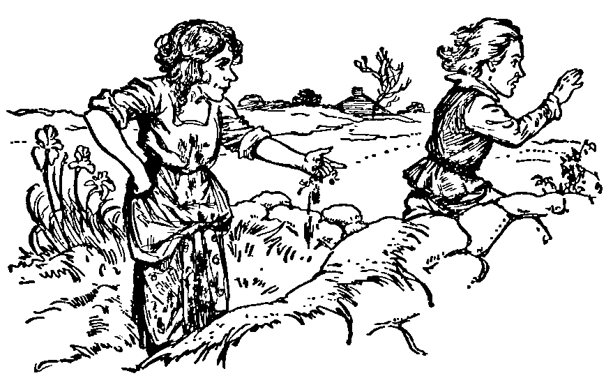 The setting sun was shining upon the brilliant stones, and their changing hues and sparkling rays caused the children to pause to admire them also.