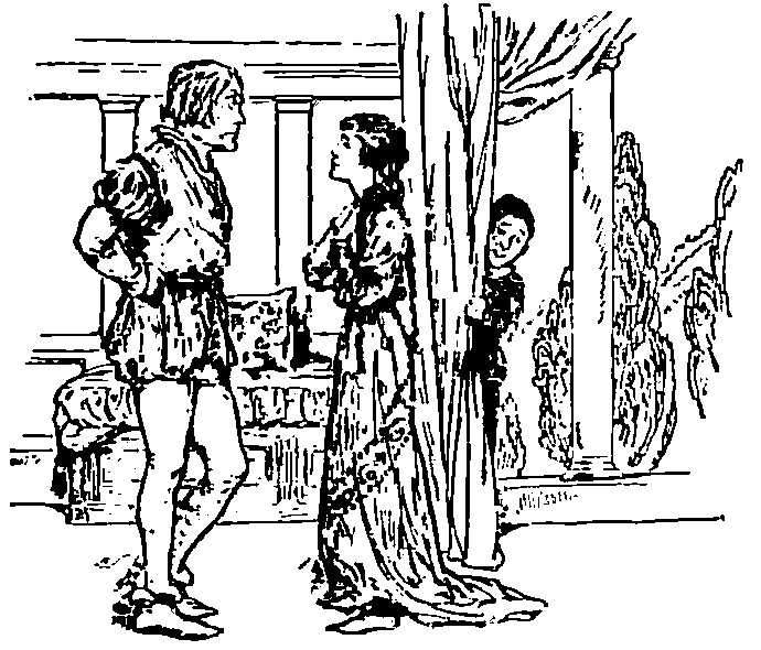 One morning, not long after the springing up of the apple-tree, the three sisters were all standing together beneath it, when in the distance a young Knight was seen riding toward them. "Make haste, Two-Eyes!" exclaimed the two elder sisters; "make haste, and creep out of our way, that we may not be ashamed of you"; and so saying, they put over her in great haste an empty cask which stood near, and which covered the golden apples as well, which she had just been plucking. Soon the Knight came up to the tree, and the sisters saw he was a very handsome man, for he stopped to admire the fine silver leaves and golden fruit, and presently asked to whom the tree belonged, for he should like to have a branch off it. One-Eye and Three-Eyes replied that the tree belonged to them; and they tried to pluck a branch off for the Knight. They had their trouble for nothing, however, for the boughs and fruit flew back as soon as they touched them. "This is very wonderful." cried the Knight, "that this tree should belong to you, and yet you cannot pluck the fruit!" The sisters, however, maintained that it was theirs; but while they spoke Two-Eyes rolled a golden apple from underneath the cask, so that it travelled to the feet of the Knight, for she was angry, because her sisters had not spoken the truth. When he saw the apple he was astonished, and asked where it came from; and One-Eye and Three-Eyes said they had another sister, but they dared not let her be seen, because she had only two eyes, like common folk! The Knight, however, would see her, and called, "Two-Eyes, come here!" and soon she made her appearance from under the cask. The Knight was bewildered at her great beauty, and said, "You, Two-Eyes, can surely break off a bough of this tree for me?" "Yes," she replied, "that I will, for it is my property"; and climbing up, she easily broke off a branch with silver leaves and golden fruit, which she handed to the Knight. "What can I give you in return, Two-Eyes?" asked the Knight. "Alas! if you will take me with you I shall be happy, for now I suffer hunger and thirst, and am in trouble and grief from early morning to late evening; take me, and save me!" Thereupon the Knight raised Two-Eyes upon his saddle, and took her home to his father's castle. There he gave her beautiful clothes, and all she wished for to eat or to drink; and afterward, because his love for her had become so great, he married her, and a very happy wedding they had.