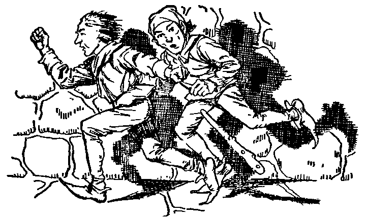 Soon after this it chanced that the poor widow sent her children to the town to purchase cotton, needles, ribbon, and tape. The way to the town ran over a common, on which in every direction large masses of rocks were scattered about. The children's attention was soon attracted to a big bird that hovered in the air. They remarked that, after circling slowly for a time, and gradually getting nearer to the ground, it all of a sudden pounced down amongst a mass of rock. Instantly a heartrending cry reached their ears, and, running quickly to the place, they saw, with horror, that the eagle had seized their former acquaintance, the dwarf, and was just about to carry him off. The kind children did not hesitate for an instant. They took a firm hold of the little man, and strove so stoutly with the eagle for possession of his contemplated prey, that, after much rough treatment on both sides, the dwarf was left in the hands of his brave little friends, and the eagle took to flight.