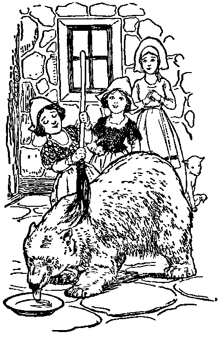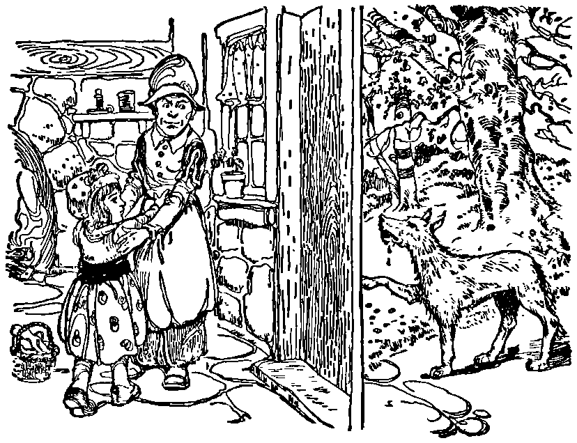 "What are you gazing at?" cried the dwarf, at the same time becoming red with rage; "and what are you standing there for, making ugly faces?" It is probable that he might have proceeded in the same complimentary manner, but suddenly a great growl was heard near by them, and a big black bear joined the party. Up jumped the dwarf in extremest terror, but could not get to his hiding-place, the bear was too close to him; so he cried out in very evident anguish—