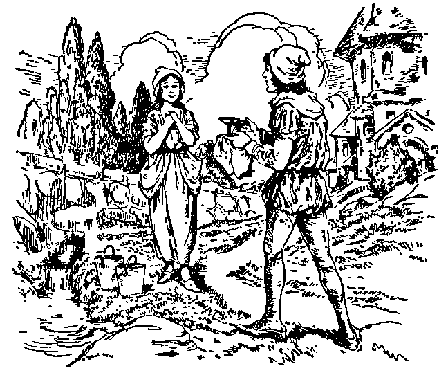 One day, as they were riding along by the side of a brook, the princess began to feel very thirsty, and said to her maid, "Pray get down and fetch me some water in my golden cup out of yonder brook, for I want to drink." "Nay," said the maid, "if you are thirsty, get down yourself, and lie down by the water and drink; I shall not be your waiting-maid any longer." The princess was so thirsty that she got down, and knelt over the little brook and drank, for she was frightened, and dared not bring out her golden cup; and then she wept, and said, "Alas! what will become of me?" And the lock of hair answered her, and said—
