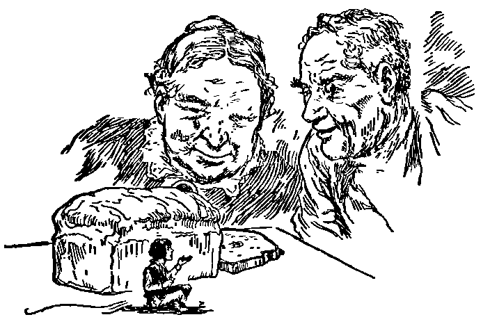 As soon as the little man had in some measure recovered from his alarm, his small squeaky, cracked voice was heard saying, "Couldn't you have held me more gently? See my little coat; you have rent and damaged it in a fine manner, you clumsy, officious things!" Then he picked up a sack of jewels, and slipped out of sight behind a piece of rock.