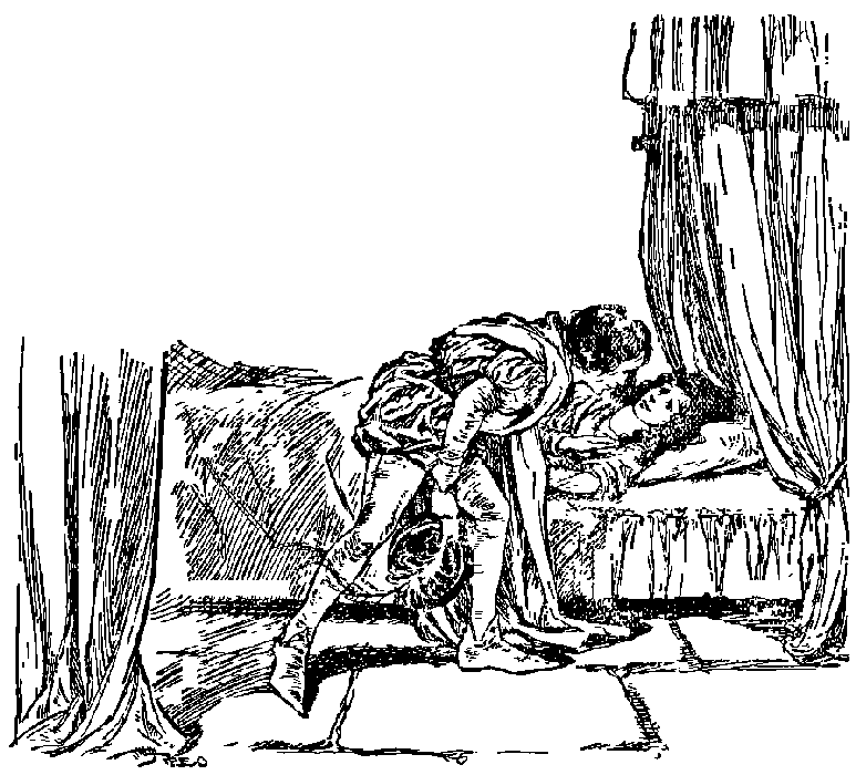 Then she came up in the form of the Queen to the cradle, and gave the child drink, shook up his bed, and covered him up, and then swam away again as a duck through the brook. The second night she came again; and on the third she said to the kitchen-boy, "Go and tell the King to take his sword, and swing it thrice over me, on the threshold." Then the boy ran and told the King, who came with his sword, and swung it thrice over the Duck; and at the third time his bride stood before him, bright, living, and healthful, as she had been before.