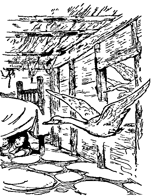 Then the wind came and blew off his hat, and off it flew a great distance over the hills and far away, so that he had to run after it: and when he came back, she had done up her hair again, and all was safe. So they watched the geese till it grew dark.