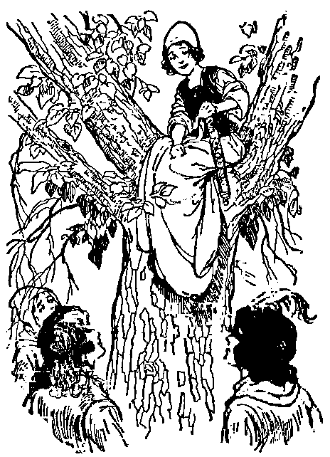 The following morning they found in front of the house a wonderfully beautiful tree, with leaves of silver and fruits of gold hanging from the boughs, than which nothing more splendid could be seen in the world. The two elder sisters were quite ignorant how the tree came where it stood; but Two-Eyes perceived that it was produced by the goat's entrails, for it stood on the exact spot where she had buried them. As soon as the mother saw it she told One-Eye to break off some of the fruit. One-Eye went up to the tree, and pulled a bough toward her, to pluck off the fruit; but the bough flew back again directly out of her hands; and so it did every time she took hold of it, till she was forced to give up, for she could not obtain a single golden apple in spite of all her endeavors. Then the mother said to Three-Eyes, "Do you climb up, for you can see better with your three eyes than your sister with her one." Three-Eyes, however, was not more fortunate than her sister, for the golden apples flew back as soon as she touched them. At last the mother got so impatient that she climbed the tree herself; but she met with no more success than either of her daughters, and grasped the air only when she thought she had the fruit. Two-Eyes now thought she would try, and said to her sisters, "Let me get up, perhaps I may be successful." "Oh, you are very likely indeed," said they, "with your two eyes: you will see well, no doubt!" So Two-Eyes climbed the tree, and directly she touched the boughs the golden apples fell into her hands, so that she plucked them as fast as she could, and filled her apron before she went down. Her mother took them of her, but returned her no thanks; and the two sisters, instead of treating Two-Eyes better than they had done, were only the more envious of her, because she alone could gather the fruit—in fact, they treated her worse.