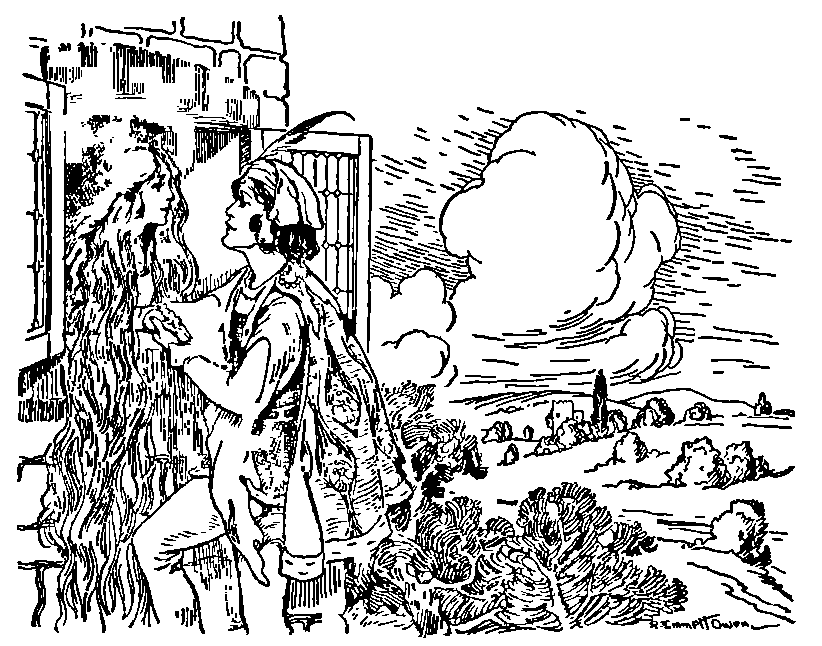 Then they went out of the city, driving the geese. And when they came to the meadow, the princess sat down upon a bank there and let down her waving locks of hair, which were all of pure gold; and when Curdken saw it glitter in the sun, he ran up, and would have pulled some of the locks out; but she cried—