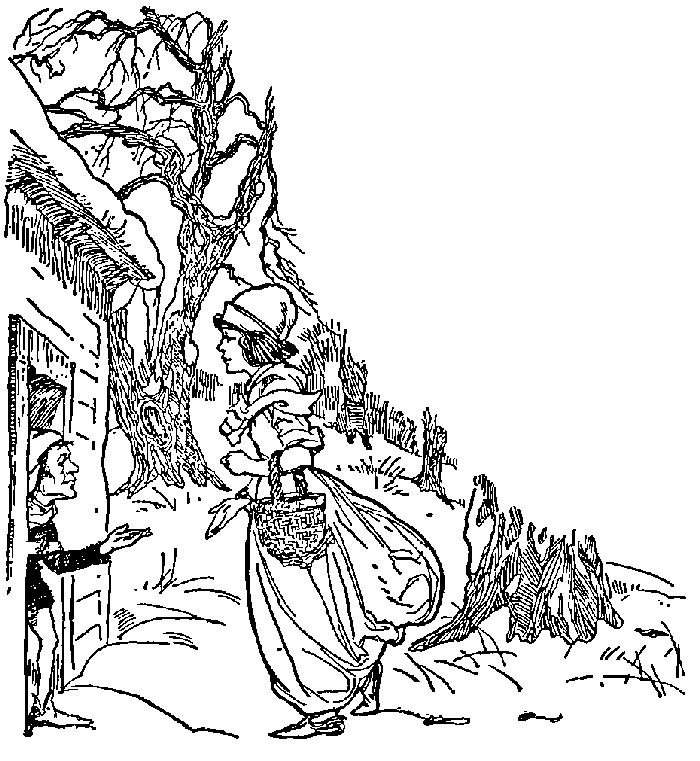 So the girl did as she was told, and put on the paper cloak, and went away with the basket. Far and near there was nothing but snow, and not a green blade was to be seen. When she came to the forest she discovered a little cottage, out of which three little Dwarfs were peeping. The girl wished them good morning, and knocked gently at the door. They called her in, and entering the room, she sat down on a bench by the fire to warm herself, and eat her breakfast. The Dwarfs called out, "Give us some of it!" "Willingly," she replied, and, dividing her bread in two, she gave them half. They asked, "What do you here in the forest, in the winter-time, in this thin cloak?"