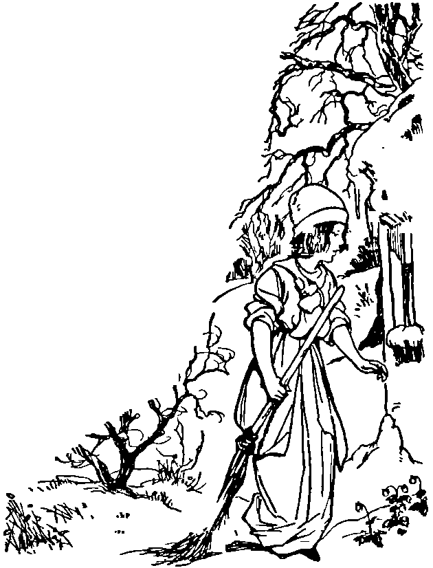"Ah!" she answered, "I must, seek a basketful of strawberries, and I dare not return home until I can take them with me." When she had eaten her bread, they gave her a broom, saying, "Sweep away the snow with this from the back door." But when she was gone out of doors the three Dwarfs said one to another, "What shall we give her, because she is so gentle and good, and has shared her bread with us?" Then said the first, "I grant to her that she shall become more beautiful every day." The second said, "I grant that a piece of gold shall fall out of her mouth for every word she speaks." The third said, "I grant that a King shall come and make her his bride."
