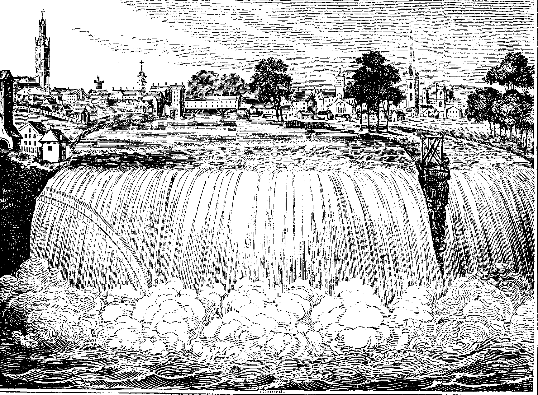 The Engraving includes the falls of the river, with the village of Rochester, seven miles south of Lake Ontario. This place, for population, extent, and trade, will soon rank among the American cities: it was not settled until about the close of the last war; its progress was slow until the year 1820, from which period it has rapidly improved. In 1830 it contained upwards of 12,000 inhabitants: the first census of the village was taken in December, 1815, when the number of inhabitants was three hundred and thirty-one. The aqueduct which takes the Erie canal across the river forms a prominent object of interest to all travellers. It is of hewn stone, containing eleven arches of 50 feet span: its length is 800 feet, but a considerable part of each end is hidden from view by mills erected since its construction.