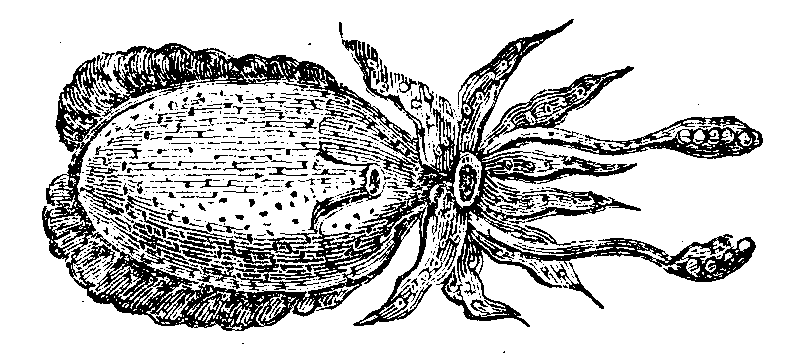 The Cuttle-fish is described by some naturalists, as naked or shell-less. It is often found attached to the shell of the Paper Nautilus, which it is said to use as a sail. It is, however, very doubtful whether the Cuttle-fish has a shell of its own. There is a controversy upon the subject. Aristotle, and our contemporary, Home, maintain it to be parasitical: Cuvier and Ferrusac, non-parasitical; but the curious reader will find the pro and con.—the majority and minority—in the Magazine of Natural History, vol. iii. p. 535.