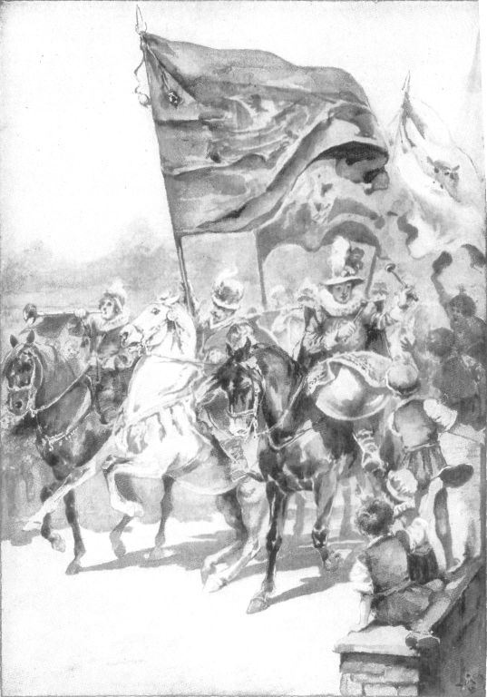 Fynes Morrison and Walter Stirley, who had gone to Cowslip lane to meet the march, were running on ahead, and shouting as they ran: “There’s forty men, and sumpter-mules! and, oh, the bravest banners and attire—and the trumpets are a cloth-yard long! Make room for us, make room for us, and let us up!”