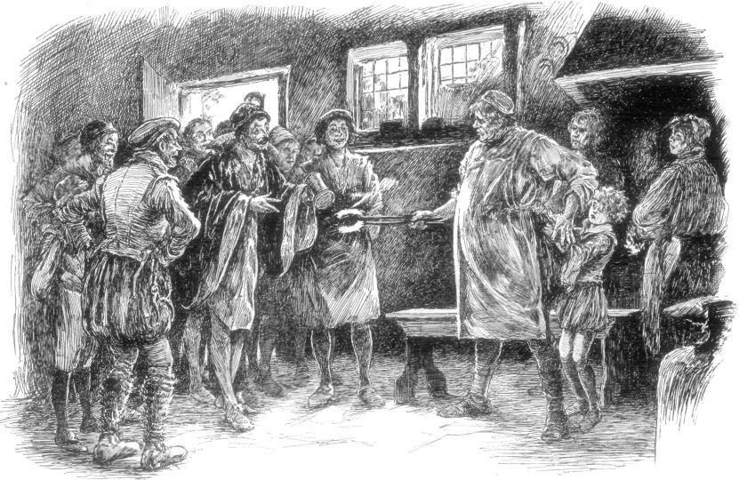 “Why,” said Robin, “it was just this way—my father told me of it. Sir Thomas Lucy, High Sheriff of Worcester, y’ know, rode in from Charlcote yesternoon, and with him Sir Edward Greville of Milcote. So the burgesses made a feast for them at the Swan Inn. Sir Thomas fetched a fine, fat buck, and the town stood good for ninepence wine and twopence bread, and broached a keg of sturgeon. And when they were all met together there, eating, and drinking, and making merry—what? Why, in came my Lord Admiral’s players from London town, ruffling it like high dukes, and not caring two pops for Sir Thomas, or Sir Edward, or for Stratford burgesses all in a heap; but sat them down at the table straightway, and called for ale, as if they owned the place; and not being served as soon as they desired, they laid hands upon Sir Thomas’s server as he came in from the buttery with his tray full, and took both meat and drink.”