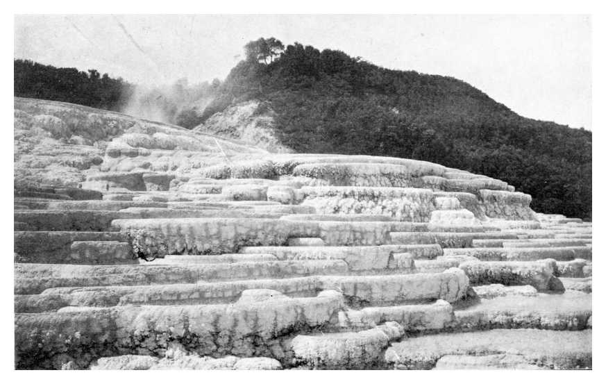 The extreme south and north of the North Island could hardly, by any stretch of imagination, be called rich and fertile. But the island demonstrates the "falsehood of extremes," for between them is found some of the finest and pleasantest land in the southern hemisphere. Nearly all of this, however, lies within fifty miles of one or other coast. When you have left these tracts, and have risen a thousand feet or so, you come to a volcanic plateau, clad for the most part in dark green and rusty bracken or tussocks of faded yellow. Right in the centre rise the great volcanoes, Ruapehu, Tongariro and Tarawera, majestic in their outlines, fascinating because of the restless fires within and the outbreaks which have been and will again take place. Scattered about this plateau are lakes of every shape and size, from Taupo—called Te Moana (the sea) by the Maoris—to the tiniest lakelets and ponds. Here are found pools and springs of every degree of heat. Some are boiling cauldrons into which the unwary fall now and again to meet a death terrible, yet—if the dying words of some of them may be believed—not always agonizing, so completely does the shock of contact with the boiling water kill the nervous system. Many pools are the colour of black broth. Foul with mud and sulphur, they seethe and splutter in their dark pits, sending up clouds of steam and sulphurous fumes. Others are of the clearest green or deepest, purest blue, through which thousands of silver bubbles shoot up to the surface, flash, and vanish. But the main use of the hot springs is found in their combination of certain chemical properties,—sulphur-acid, sulphur-alkaline. Nowhere in the world, probably, are found healing waters at once so powerful and so various in their uses. Generations ago the Maori tribes knew something of their effects. Now invalids come from far and near in hundreds and thousands, and when the distractions and appliances of the sanitary stations equal those of the European spas they will come in tens of thousands, for the plateau is not only a health-resort but a wonderland. Its geysers rank with those of Iceland and the Yellowstone. Seen in the clear sunny air, these columns of water and white foam, mounting, swaying, blown by the wind into silver spray, and with attendant rainbows glittering in the light, are sights which silence even the chattering tourist for a while. Solfataras, mud volcanoes and fumaroles are counted in hundreds in the volcanic zone. If there were not such curiosities, still the beauty of the mountains, lakes, streams and patches of forest would, with the bright invigorating air, make the holiday-maker seek them in numbers. Through the middle of this curious region runs the Waikato, the longest and on the whole most tranquil and useful of that excitable race the rivers of New Zealand. Even the Waikato has its adventures. In one spot it is suddenly compressed to a sixth of its breadth, and, boiling between walls of rock, leaps in one mass of blue water and white foam into a deep, tree-fringed pool below. This is the Huka Waterfall. It is but one of the many striking falls to be met with in the Islands.