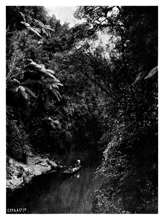Of forest rivers, the Wanganui is the longest and most famous, perhaps the most beautiful. Near the sea it is simply a broad river, traversed by boats and small steamers, and with grassy banks dotted with weeping willows or clothed with flax and the palm-lily. But as you ascend it the hills close in. Their sides become tall cliffs, whose feet the water washes. From the tops of these precipices the forest, growing denser and richer at every turn, rises on the flanks of the hills. In places the cliffs are so steep and impracticable that the Maoris use ladders for descending on their villages above to their canoes in the rivers below. Lovely indeed are these cliffs; first, because of the profusion of fern frond, leaf, and moss, growing from everything that can climb to, lay hold of, or root itself in crack, crevice, or ledge, and droop, glistening with spray-drops, or wave whispering in the wind; next, because of the striking form and colour of the cliffs themselves. They are formed of what is called "Papa." This is a blue, calcareous clay often found with limestone, which it somewhat resembles. The Maori word "papa" is applied to any broad, smooth, flattish surface, as a door, or to a slab of rock. The smooth, slab-like, papa cliffs are often curiously marked—tongued and grooved, as with a gouge, channelled and fluted. Sometimes horizontal lines seem to divide them into strata. Again, the lines may be winding and spiral, so that on looking at certain cliffs it might be thought possible that the Maoris had got from them some of their curious tattoo patterns. Though pale and delicate, the tints of the rock are not their least beauty. Grey, yellow, brown, fawn, terra-cotta, even pale orange are to be noted. No photograph can give the charm of the drapery that clothes these cliffs. Photographs give no light or colour, and New Zealand scenery without light and colour is Hamlet with Hamlet left out. How could a photograph even hint at the dark, glossy green of the glistening karaka leaves, the feathery, waving foliage of the lace bark, or the white and purple bloom of the koromiko? How could black-and-white suggest the play of shade and shine when, between flying clouds, the glint of sunlight falls upon the sword-bayonet blades of the flax, and the golden, tossing plumes of the toe-toe, the New Zealand cousin of the Pampas grass? Add to this, that more often than the passenger can count as he goes along the river, either some little rill comes dripping over the cliff, scattering the sparkling drops on moss and foliage, or the cliffs are cleft and, as from a rent in the earth, some tributary stream gushes out of a dark, leafy tunnel of branches. Sometimes, too, the cliffs are not cleft, but the stream rushes from their summit, a white waterfall veiling the mossy rocks. Then there are the birds. In mid-air is to be seen the little fan-tail, aptly named, zig-zagging to and fro. The dark blue tui, called parson bird, from certain throat-feathers like white bands, will sing with a note that out-rivals any blackbird. The kuku, or wild pigeon, will show his purple, copper-coloured, white and green plumage as he sails slowly by, with that easy, confiding flight that makes him the cheap victim of the tyro sportsman. The grey duck, less easy to approach, rises noisily before boat or canoe comes within gunshot. The olive and brown, hoarse-voiced ka-ka, a large, wild parrot, and green, crimson-headed parakeets, may swell the list. Such is a "papa" river! and there are many such.