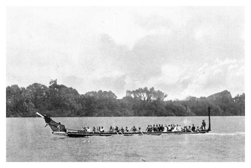 The Maori stories of their migration to New Zealand are a mixture of myth and legend. Among them are minute details that may be accurate, mingled with monstrous tales of the utterly impossible. For example, we are told that one chief, on his canoe first nearing the coast, saw the feathery, blood-red rata-flowers gleaming in the forest, and promptly threw overboard his Polynesian coronet of red feathers, exclaiming that he would get a new crown in the new land. Such an incident might be true, as might also the tale of another canoe which approached the shore at night. Its crew were warned of the neighbourhood of land by the barking of a dog which they had with them and which scented a whale's carcass stranded on the beach. On the other hand we are gravely told that the hero Gliding-Tide having dropped an axe overboard off the shore, muttered an incantation so powerful that the bottom of the sea rose up, the waters divided, and the axe returned to his hand. The shoal at any rate is there, and is pointed out to this day. And what are we to say to the tale of another leader, whose canoe was upset in the South Seas, and who swam all the way to New Zealand?