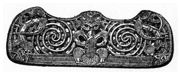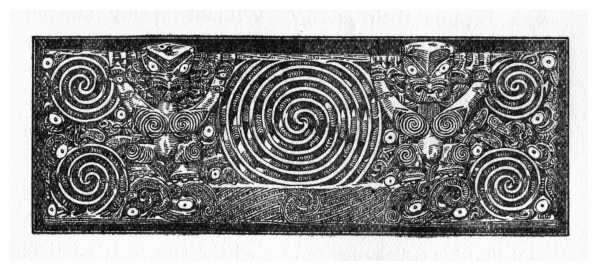 Nor did Maori skill confine itself to ornamenting the clothing of man. The human skin supplied a fresh and peculiar field for durable decoration. This branch of art, that of Moko or tattooing, they carried to a grotesque perfection. Among the many legends concerning their demi-god Maui, a certain story tells how he showed them the way to tattoo by puncturing the muzzle of a dog, whence dogs went with black muzzles as men see them now. For many generations the patterns cut and pricked on the human face and body were faithful imitations of what were believed to be Maui's designs. They were composed of straight lines, angles, and cross-cuts. Later the hero Mataora taught a more graceful style which dealt in curves, spirals, volutes and scroll-work. Apart from legend it is a matter of reasonable certitude that the Maoris brought tattooing with them from Polynesia. Their marking instruments were virtually the same as those of their tropical cousins; both, for instance, before the iron age of the nineteenth century, often used the wing-bones of sea-birds to make their tiny chisels. Both observed the law of tapu under which the male patients, while undergoing the process of puncturing, were sacred, immensely to their own inconvenience, for they had to dwell apart, and might not even touch food with their hands. As to the source of the peculiar patterns used by the New Zealanders, they probably have some relation with the admirable wood-carving before mentioned. Either the Moko artists copied the style of the skilful carvers of panels, door-posts, clubs, and the figure-heads on the prows of canoes, or the wood-carvers borrowed and reproduced the lines and curves of the Moko. The inspiration of the patterns, whether on wood or skin, may be found in the spirals of sea-shells, the tracery on the skin of lizards and the bark of trees, and even, it may be, in the curious fluting and natural scroll-work on the tall cliffs of the calcareous clay called papa.