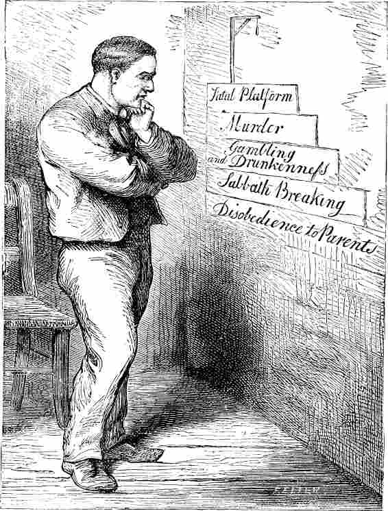 The effects of this course of trade were seen everywhere throughout the State. In scarcely any part of it was there any evidence of business prosperity or thrift, but, generally, there was abundant evidence of poverty, untidiness and decay. In the lumbering towns and villages, where the innumerable saw-mills were, the greatest bustle and activity prevailed. The air resounded with the loud noises coming from these mills. Night and day they were "run," never ceasing until the "logs" were "worked up." Relays of hands were employed at all these lumbering centres, so that the saw-mills never stopped even for an hour during "the season," except for some occasional repairs. All these men drank rum; a quart a day per man was a moderate quantity; but a great many of them required two quarts a day. The result of this was, that the entire wages of the men were consumed in drink, except a meagre share that went to the miserable wives and children at home.