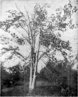 The building in which Lincoln clerked for Denton Offutt was standing as late as 1836, and presumably stood until it rotted down. A slight depression in the earth, evidently once a cellar, is all that remains of Offutt's store. Out of this hole in the ground have grown three trees, a locust, an elm, and a sycamore, seeming to spring from the same roots, and curiously twined together; and high up on the sycamore some genius has chiselled the face of Lincoln.