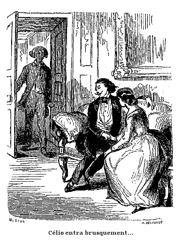 Célio entra brusquement, et, voyant Cécilia si émue et assise tout près de moi, il se retira en refermant la porte avec violence. Il avait pâli, sa figure était décomposée d'une manière effrayante. Toutes les furies de l'enfer étaient entrées dans son sein.