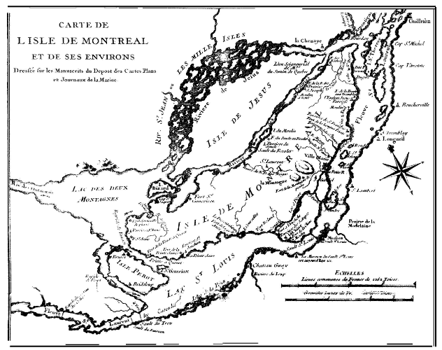 Ce site, si fort comme poste militaire, était aussi l'un des plus beaux que l'on puisse citer dans le monde. On pouvait s'en convaincre en le contemplant du haut de la montagne, ou les colons se rendaient souvent en pèlerinage. Au point le plus élevé, il y avait une croix imposante plantée par M. de Maisonneuve. De là, à cinq cents pieds au-dessus du niveau du fleuve, l'établissement paraît dans toute sa magnificence. Depuis le haut du mont descend un amphithéâtre d'une lieue de largeur qui montre des arbres variés et précieux; en bas, d'immenses prairies fertiles étaient des fleurs éclatantes; plus loin se déploie la ceinture splendide d'un fleuve profond, qui n'a pas moins d'une lieue de largeur. Au delà, pour compléter ce beau panorama, des montagnes disposées en cercle jusqu'à dix et vingt lieues dans le sud, forment comme une corbeille de verdure dont Montréal est le centre.
