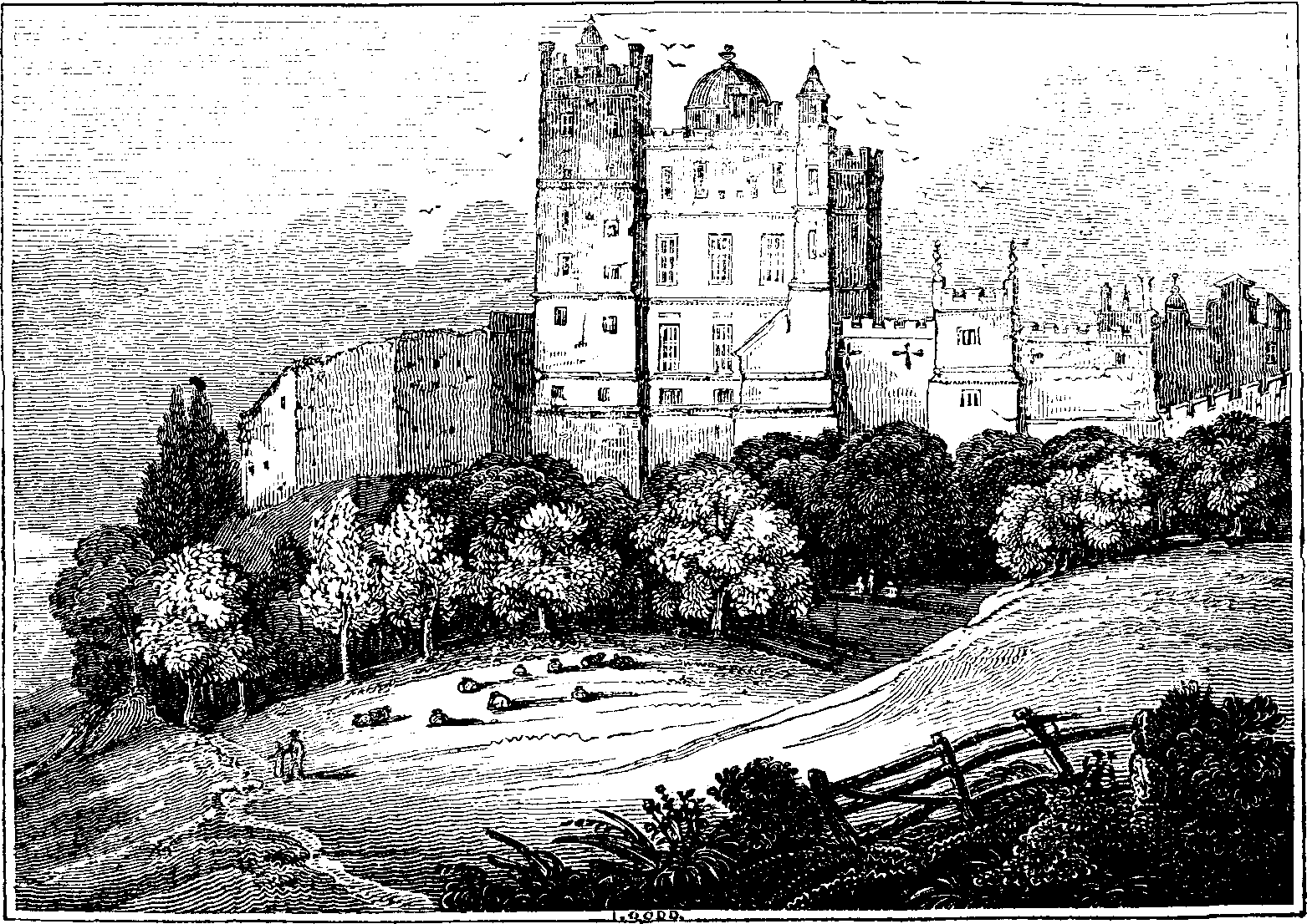 Bolsover is a populous village on the eastern verge of Derbyshire upon the adjacent county of Nottingham; and but a short distance from the town of Chesterfield. The Castle occupies the plain of a rocky hill that rises abruptly from the meadows. The building is of great extent, and, from its elevated situation, it is a landmark for the surrounding country.