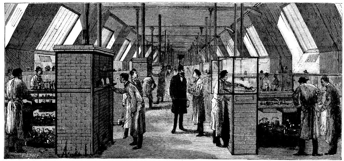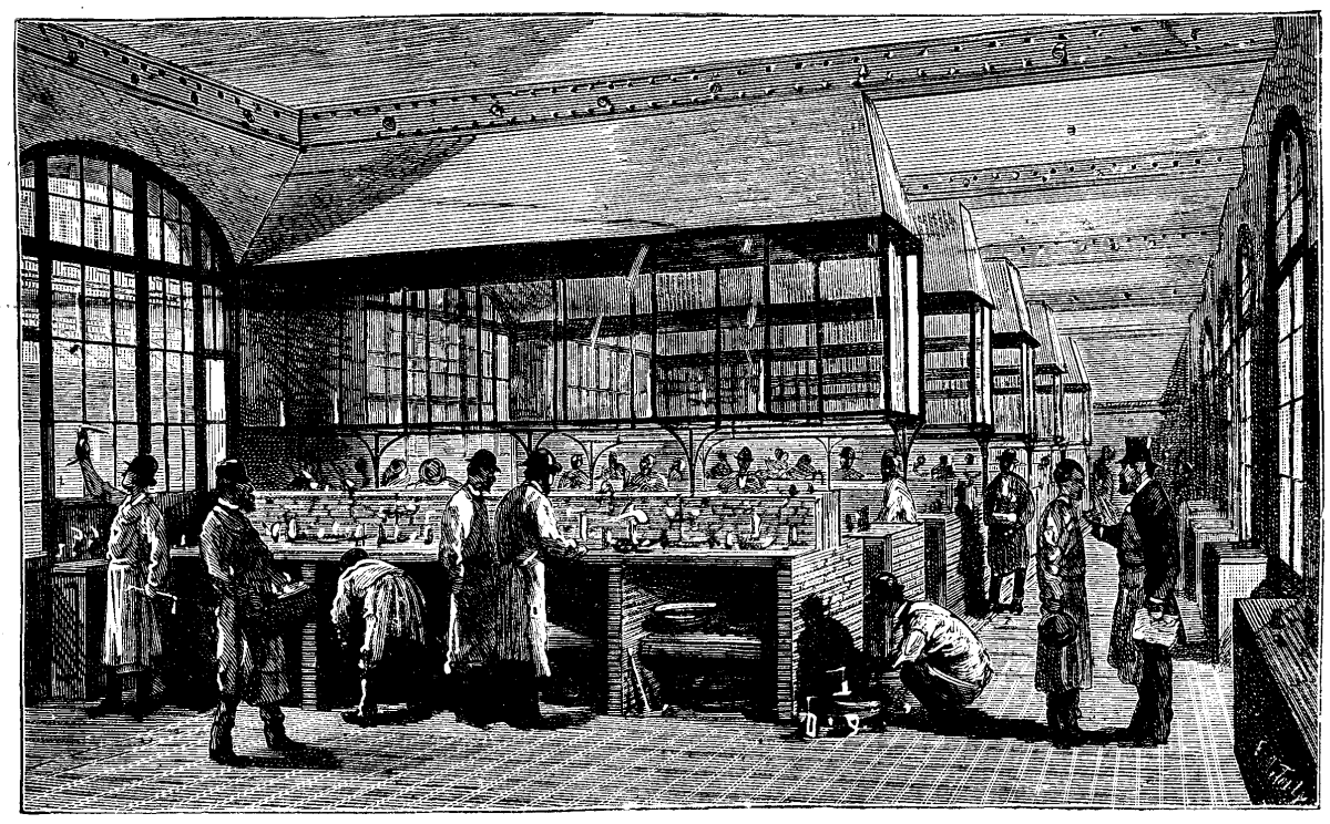 As regards the laboratories, it is allowable to say that they constitute the first great school of experimental chemistry in France. The first year laboratory consists of a series of tables, provided with evaporating hoods, at which a series of pupils will study general chemistry experimentally. Electricity, and gas and water cocks are within reach of each operator, and all the deleterious emanations from the acids that are used or are produced in studying a body will escape through the hoods.