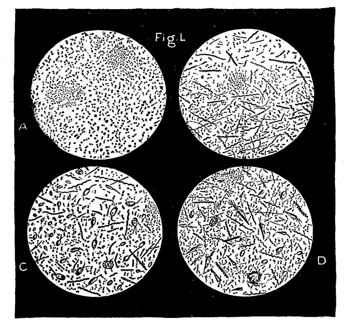 Take an illustration prepared for the purpose, and taken direct from nature. A vessel of pure drinking water was taken during the month of July at a temperature of 65 deg. F., and into it was dropped a few shreds of fish muscle and brain. It was left uncovered for twelve hours; at the end of that time a small blunt rod was inserted in the now somewhat opalescent water, and a minute drop taken out and properly placed on the microscope, and, with a lens just competent to reveal the minutest objects, examined. The field of view presented is seen in Fig. 1, A. But—with the exception of the dense masses which are known as zooglœa or bacteria, fused together in living glue—the whole field was teeming with action; each minute organism gyrating in its own path, and darting at every visible point. The same fluid was now left for sixteen hours, and once more a minute drop was taken and examined with the same lens as before. The field presented to the eye is depicted in Fig. 1, B, where it is visible that while the original organism persists yet a new organism has arisen in and invaded the fluid. It is a relatively long and beautiful spiral form, and now the movement in the field is entrancing. The original organism darts with its vigor and grace, and rebounds in all directions. But the spiral forms revolving on their axes glide like a flight of swallows over the ample area of their little sea. Ten hours more elapsed and, without change of circumstances, another drop was taken from the now palpably putrescent fluid. The result of examination is given in Fig. 1, C, where it will be seen that the first organism is still abundant, the spiral organism is still present and active, but a new and oval form, not a bacterium, but a monad, has appeared. And now the intensity of action and beauty of movement throughout the field utterly defy description, gyrating, darting, spinning, wheeling, rebounding, with the swiftness of the grayling and the beauty of the bird. Finally, at the end of another eight to sixteen hours, a final "dip" was taken from the fluid, and under the same lens it presented as a field what is seen in Fig. 1, D, where the largest of the putrefactive organisms has appeared and has even more intense and more varied movements than the others. Now the question before us is, "How did these organisms arise?" The water was pure; they were not discoverable in the fresh muscle of fish. Yet in a dozen hours the vessel of water is peopled with hosts of individual forms which no mathematics could number! How did they arise? From universally diffused eggs, or from the direct physical change of dead matter into living forms? Twelve years ago the life-histories of these forms were unknown. We did not know biologically how they developed. And yet with this great deficiency it was considered by some that their mode of origin could be determined by heat experiments on the adult forms. Roughly, the method was this: It was assumed that nothing vital could resist the boiling point of water. Fluids, then, containing full-grown organisms in enormous multitudes, chiefly bacteria, were placed in flasks, and boiled for from five to ten minutes. While they were boiling the necks of the flasks was hermetically closed; and the flask was allowed to remain unopened for various periods. The reasoning was: "Boiling has killed all forms of vitality in the flask; by the hermetical sealing nothing living can gain subsequent access to the fluid; therefore, if living organisms do appear when the flask is opened, they must have arisen in the dead matter de novo by spontaneous generation, but if they do never so arise, the probability is that they originate in spores or eggs."
