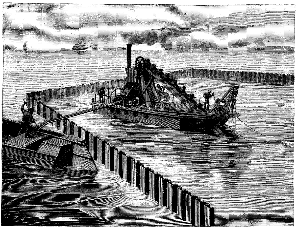 Fig. 2 represents a dredge at work within a space entirely circumscribed by pile planks. Here, after the excavation is finished, beton will be put down by means of boxes with hinged bottoms, and the water will afterward be pumped out in order to allow the masonry to be constructed in the open air. Fig. 3 shows a transverse section of two of these pile planks united by mortar joints. This system is the invention of Mr. Papenot.—Revue Industrielle.