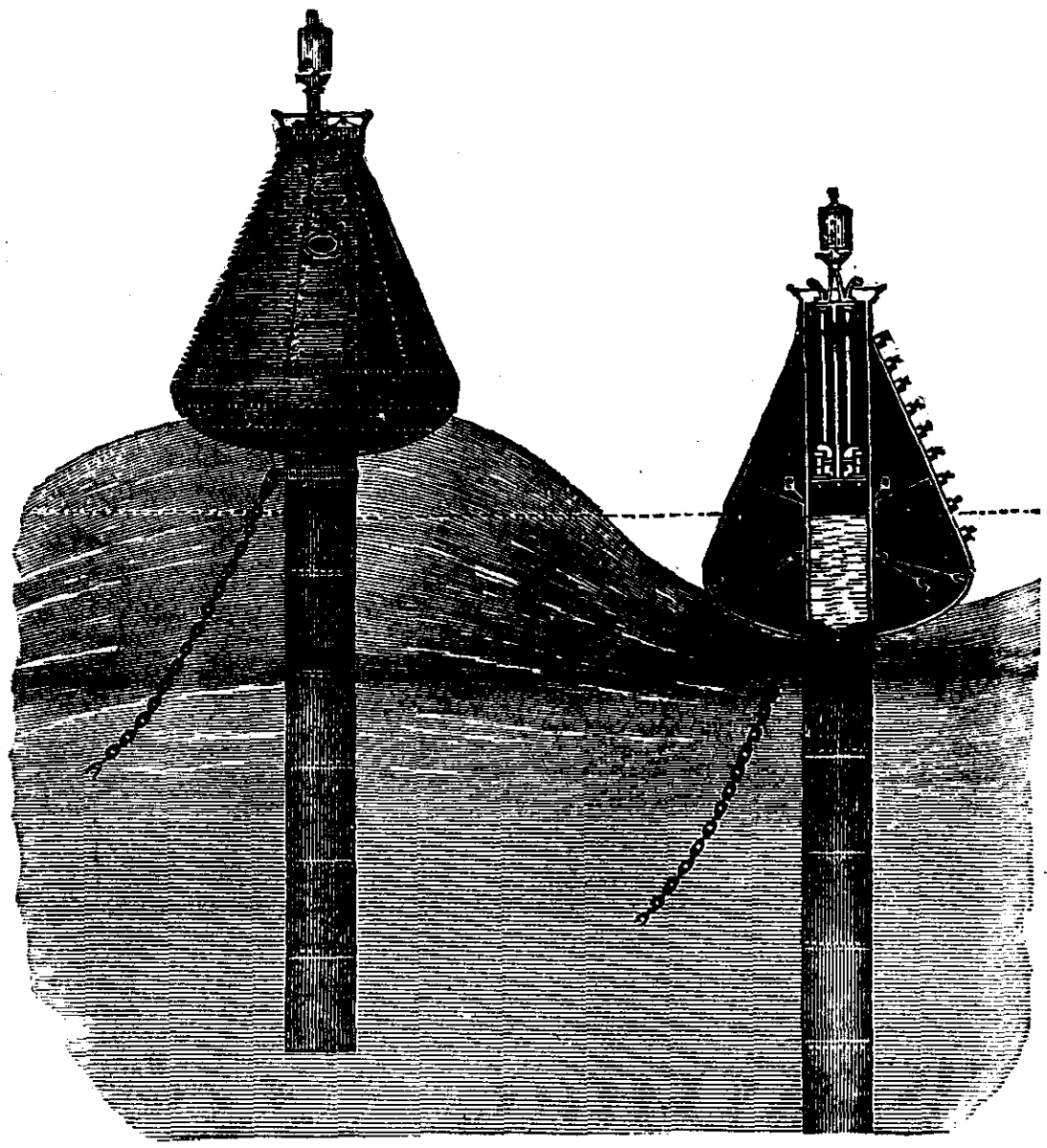 Whistling Buoys.—The whistling buoy now in use was patented by Mr. J.M. Courtenay, of New York. It consists of an iron pear-shaped bulb, 12 feet across at its widest part, and floating 12 feet out of water. Inside the bulb is a tube 33 inches across, extending from the top through the bottom to a depth of 32 feet, into water free from wave motion. The tube is open at its lower end, but projects, air-tight, through the top of the bulb, and is closed with a plate having in it three holes, two for letting the air into the tube, and one between the others for letting the air out to work the 10-inch locomotive whistle with which it is surmounted. These holes are connected with three pipes which lead down to near the water level, where they pass through a diaphragm which divides the outer cylinder into two parts. The great bulb which buoys up the whole mass rises and falls with the motion of the waves, carrying the tube up and down with it, thus establishing a piston-and-cylinder movement, the water in the tube acting as an immovable piston, while the tube itself acts as a moving cylinder. Thus the air admitted through valves, as the buoy rises on the wave, into that part of the bulb which is above water, is compressed, and as the buoy falls with the wave, it is further compressed and forced through a 2½ inch pipe which at its apex connects with the whistle. The dimensions of the whistling buoy have recently been much diminished without detracting materially from the volume of sound it produces. It is now made of four sizes. The smallest in our waters has a bulb 6 feet in diameter and a tube 10 feet in length, and weighs but 2,000 pounds. The largest and oldest whistling buoy has a 12-foot bulb, a tube 32 feet long, and weighs 12,000 pounds.