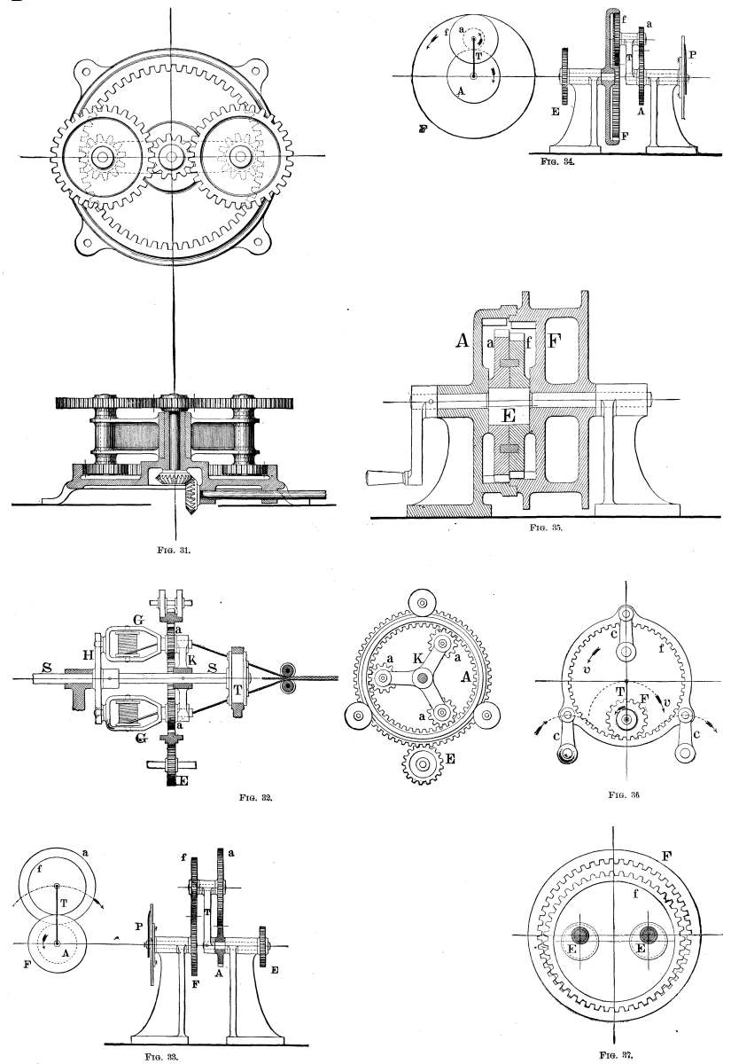The arrangement of planetary wheels which has been applied in practice to the greatest extent and to the most purposes, is probably that in which the axial motions of the train are derived from a fixed sun wheel. Numerous examples of such trains are met with in the differential gearing of hoisting machines, in portable horse-powers, etc. The action of these mechanisms has already been fully discussed; it may be remarked in addition that unless the speed be very moderate, it is found advantageous to balance the weights and divide the pressures by extending the train arm and placing the planet-wheels in equal pairs diametrically opposite each other, as, for instance, in Bogardus' horse power, Fig. 31.