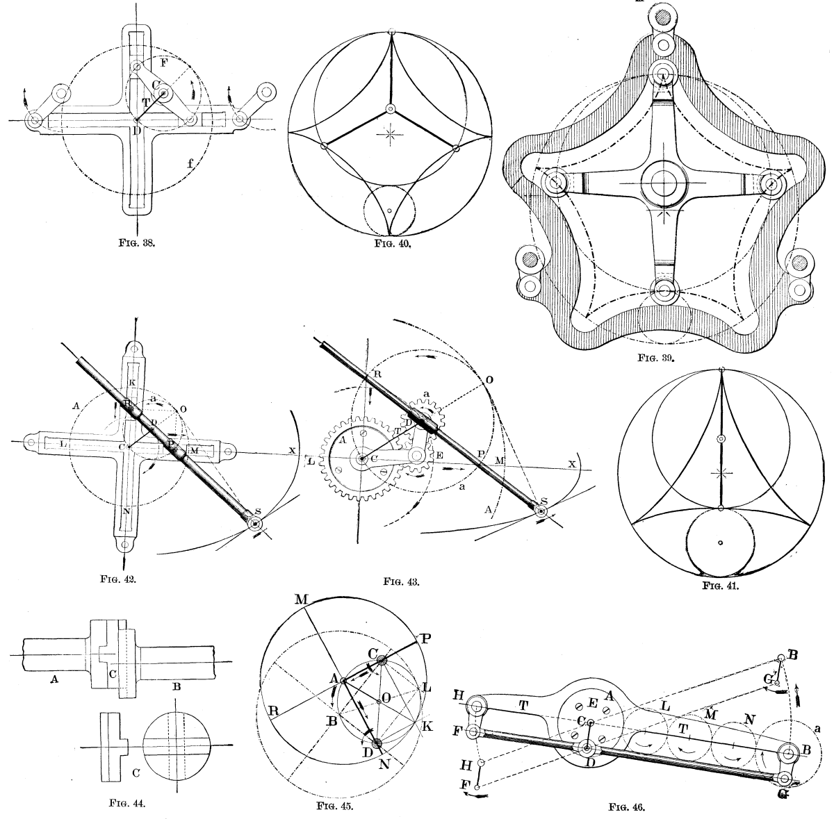 In Figs. 40 and 41 are given the skeletons of Galloway's device for ratios of 3:4 and 2:3 respectively, the former having four branches and three pins, the latter three branches and two pins. Following the analogy, it would seem that the next step should be to employ two branches with only one pin; but the rectilinear hypocycloid of Fig. 38 is a complete diameter, and the second branch is identical with the first; the straight tooth, then, could theoretically drive the pin half way round, but upon its reaching the center of the outer wheel, the driving action would cease: this renders it necessary to employ two pins and two slots, but it is not essential that the latter should be perpendicular to each other.