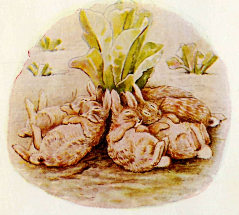 The little rabbits smiled sweetly in their sleep under the shower of grass; they did not awake because the lettuces had been so soporific.