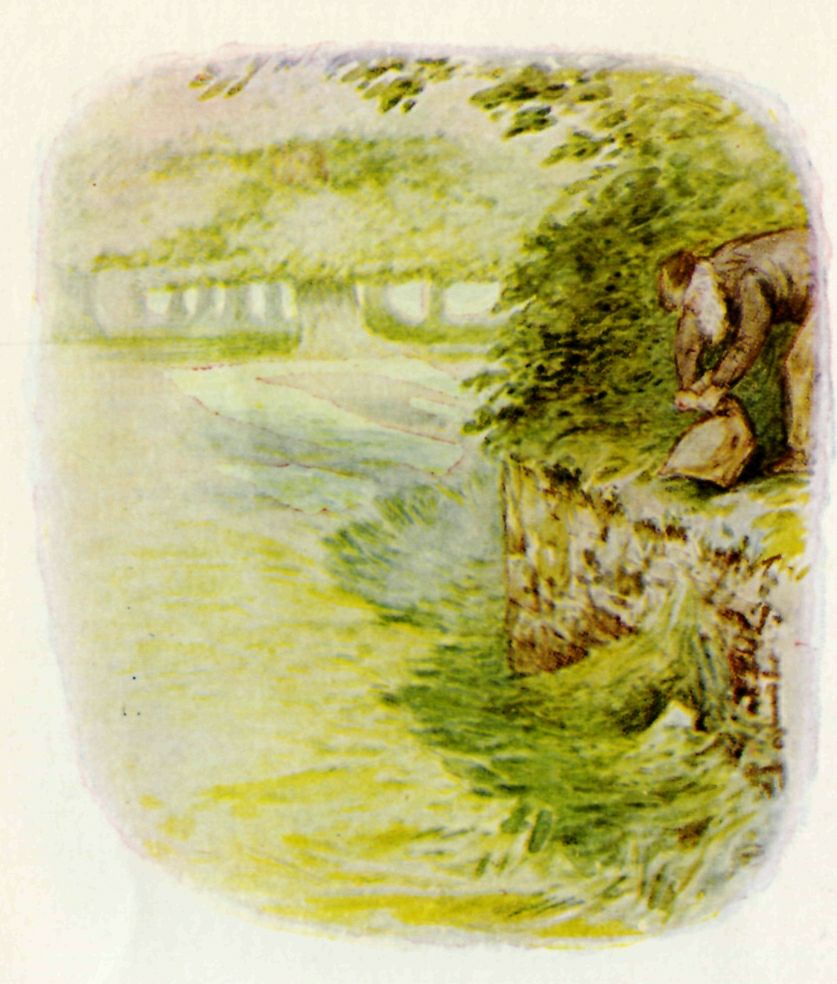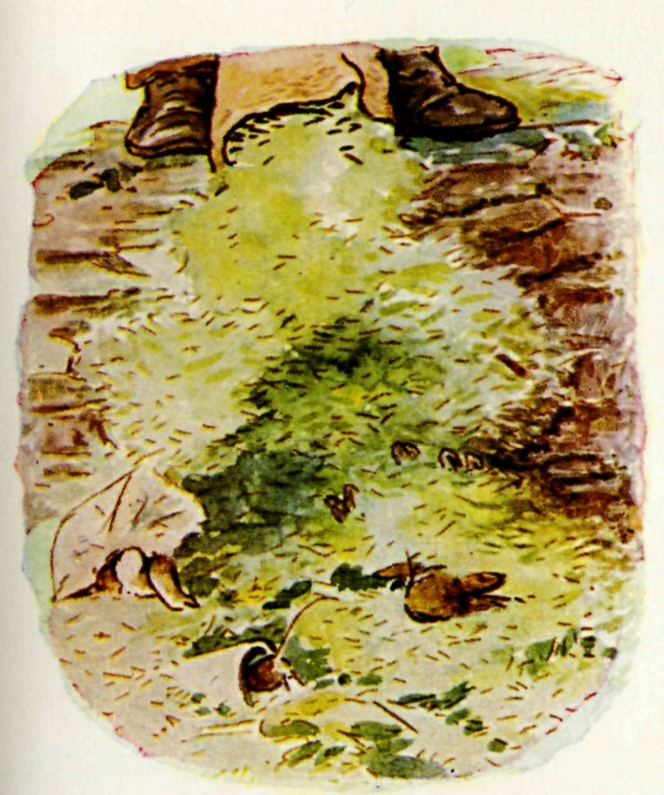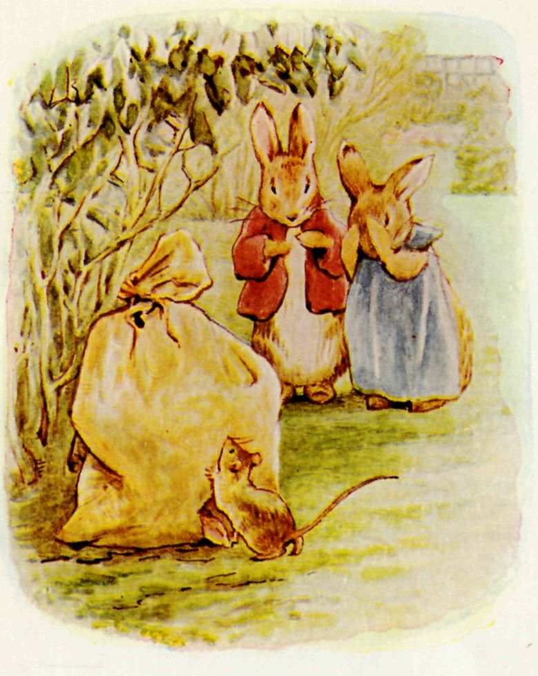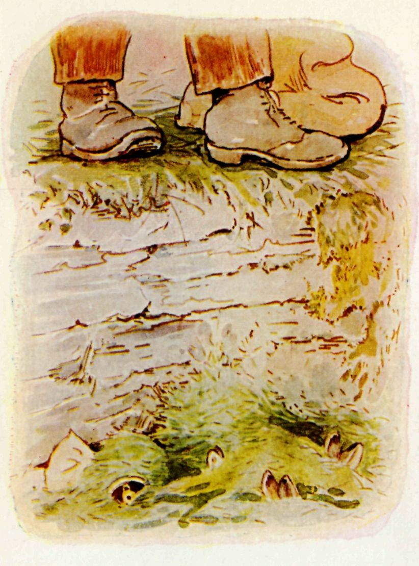 While she and Benjamin were talking, close under the wall, they heard a heavy tread above their heads; and suddenly Mr. McGregor emptied out a sackful of lawn mowings right upon the top of the sleeping Flopsy Bunnies! Benjamin shrank down under his paper bag. The mouse hid in a jam pot.